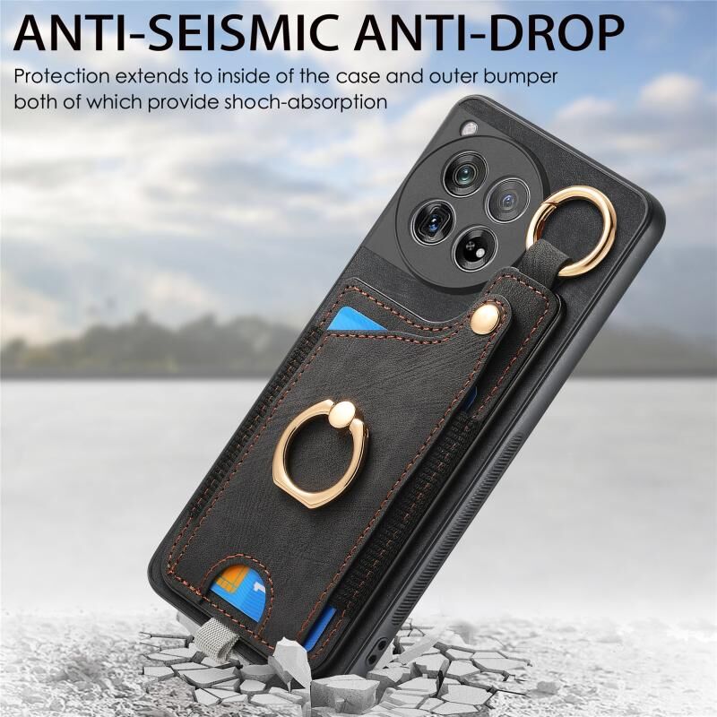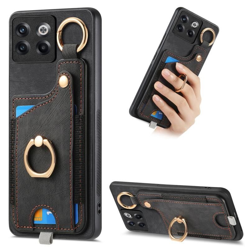 Για OnePlus 10T Ρετρό δέρμα αίσθηση δαχτυλίδι κάρτα τσάντα υπόθεση τηλεφώνου με Hang Loop (Μαύρο)