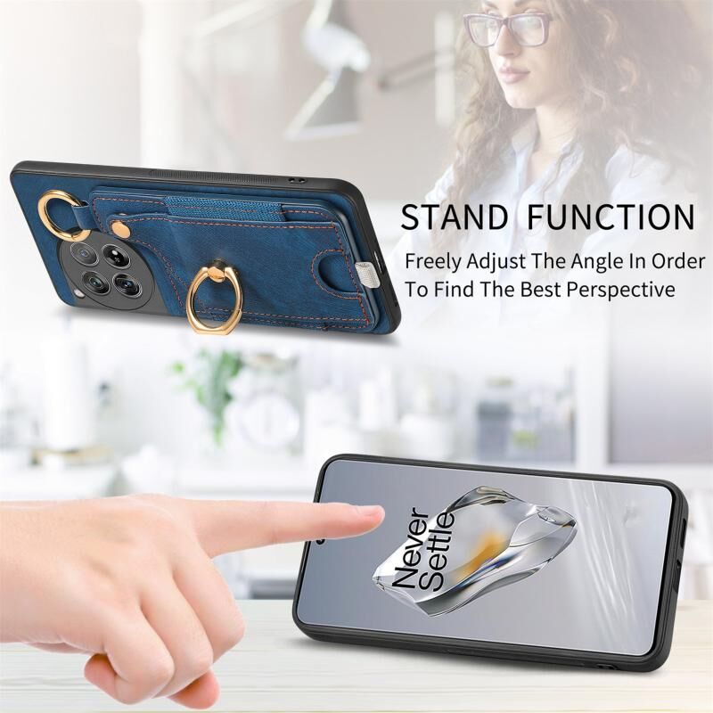 Για OnePlus 10T Ρετρό δέρμα αίσθηση δαχτυλίδι τσάντα κάρτα υπόθεση τηλεφώνου με Hang Loop (μπλε)