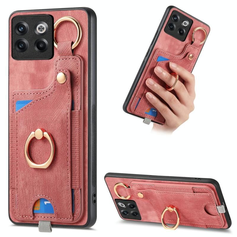 Για OnePlus 10T Ρετρό δέρμα αίσθηση δαχτυλίδι τσάντα κάρτα υπόθεση τηλεφώνου με Hang Loop (ροζ)