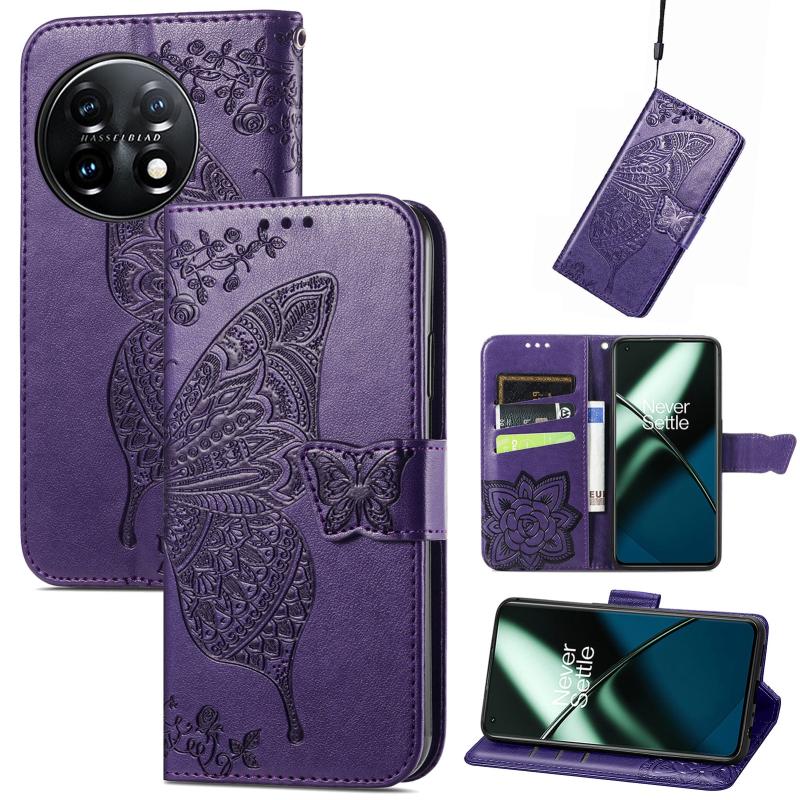 For OnePlus 11 Butterfly Love Flower Embossed Flip Leather Phone Case(Dark Purple)