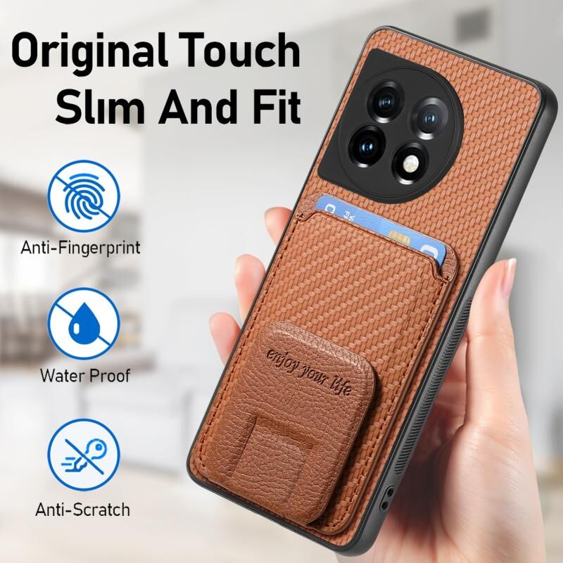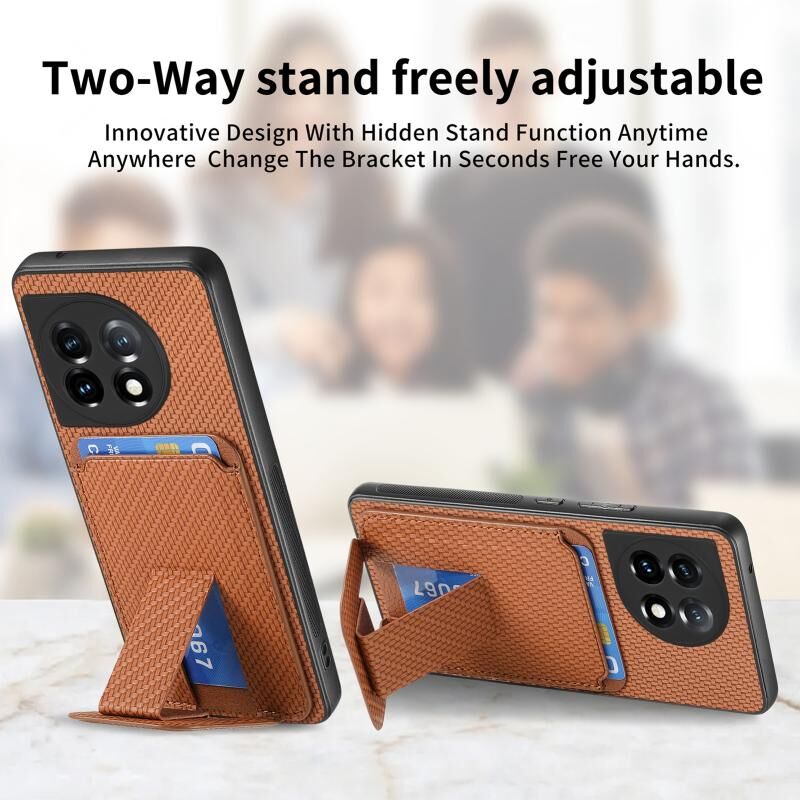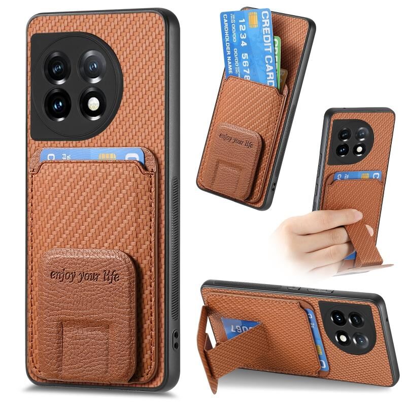For OnePlus 11 Carbon Fiber Card Bag Fold Stand Phone Case(Brown)