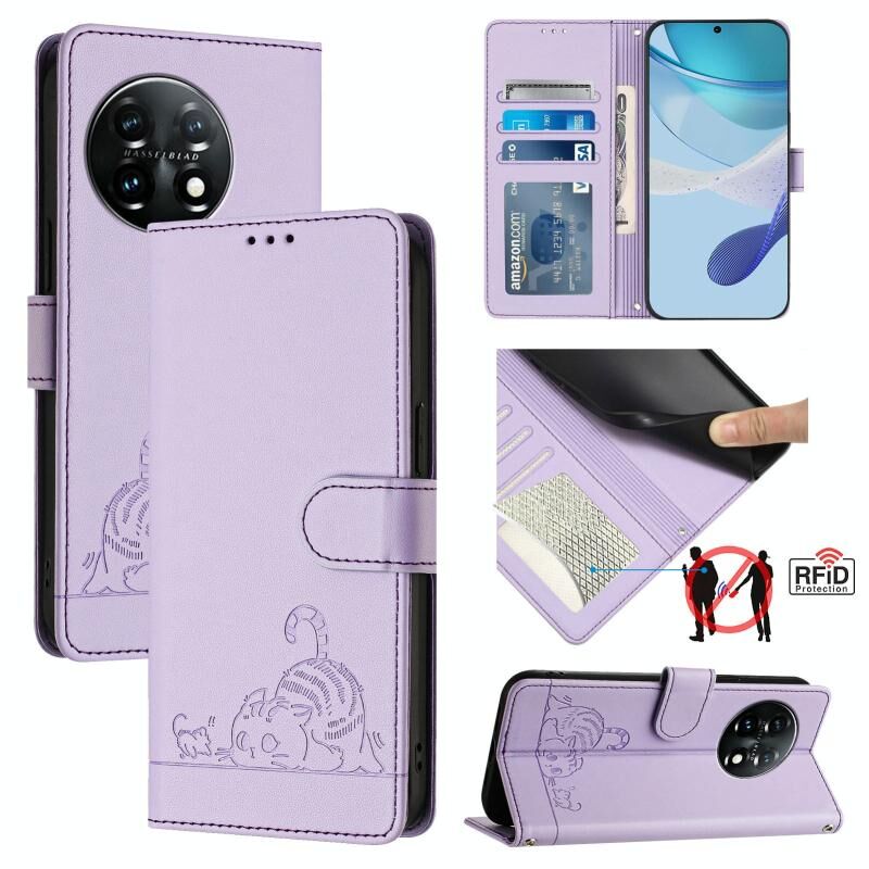 Θήκη τηλεφώνου από δέρμα με ανάγλυφο σχέδιο γάτας και αρουραίου για OnePlus 11 με λουρί (Μέντας Πράσινο)