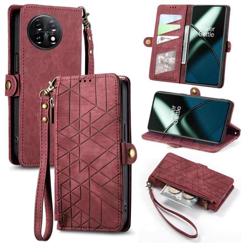 Για OnePlus 11 γεωμετρική φερμουάρ πορτοφόλι πλευρά πόρπη δερμάτινη θήκη τηλεφώνου (κόκκινο)