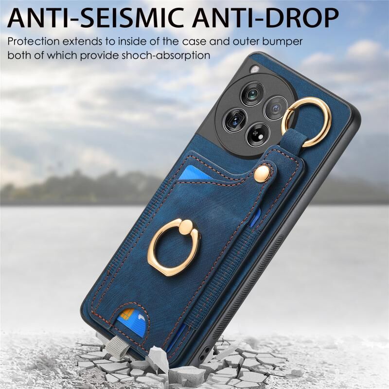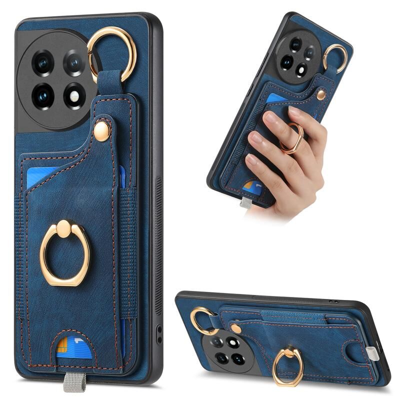 Για OnePlus 11 Ρετρό δέρμα-feel Ring Card τσάντα υπόθεση τηλεφώνου με Hang Loop (μπλε)