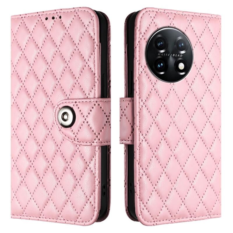 Για OnePlus 11 Rhombic υφή Flip δερμάτινη θήκη τηλεφώνου με κορδόνι (ροζ)