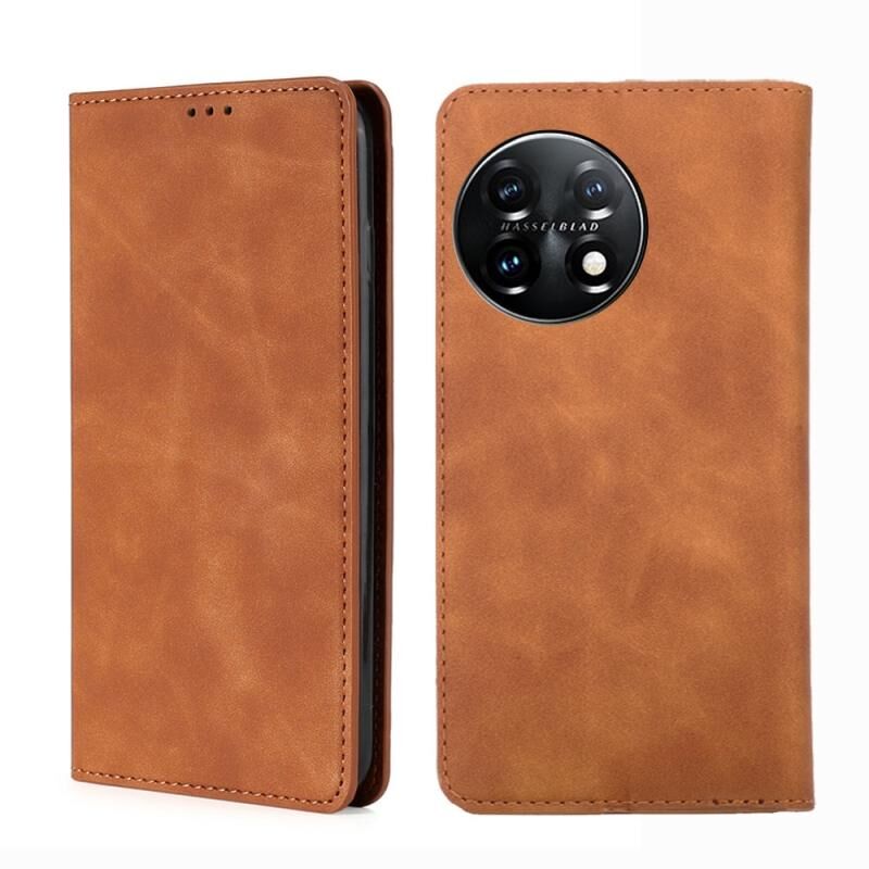 Για OnePlus 11 Skin Feel μαγνητική οριζόντια Flip δέρμα τηλέφωνο υπόθεση (ανοιχτό καφέ)