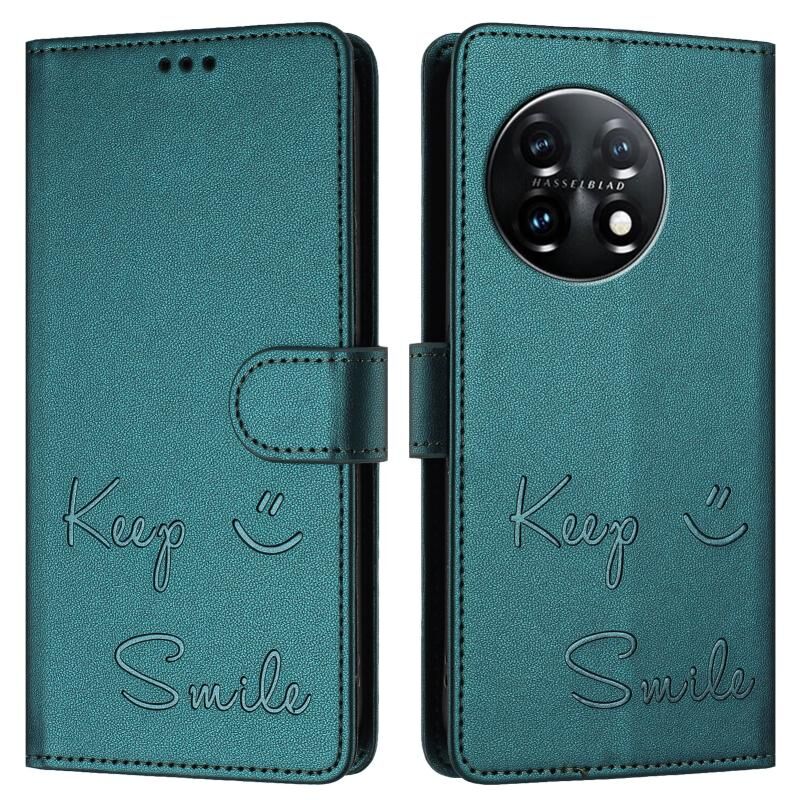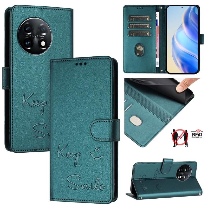Για OnePlus 11 Χαμόγελο ανάγλυφο RFID δερμάτινη θήκη τηλεφώνου (Peacock Green)