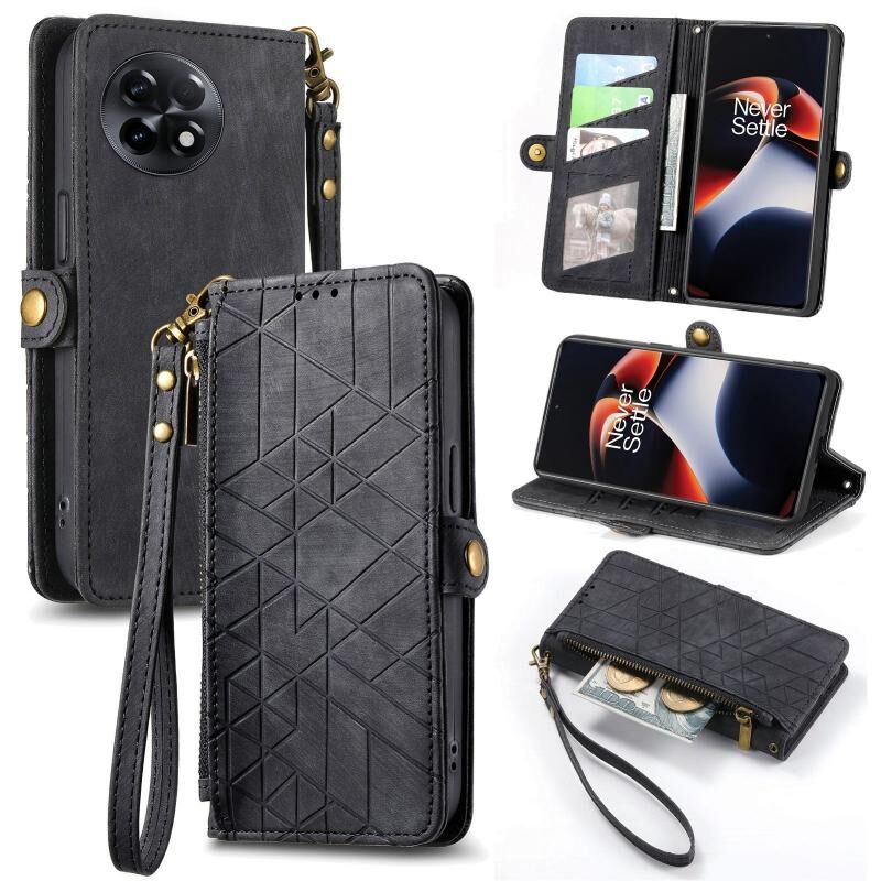 Για OnePlus 11R 5G γεωμετρική φερμουάρ πορτοφόλι πλευρά πόρπη δερμάτινη θήκη τηλεφώνου (μαύρο)