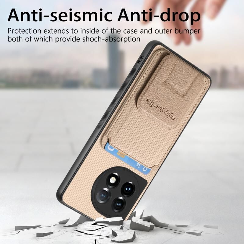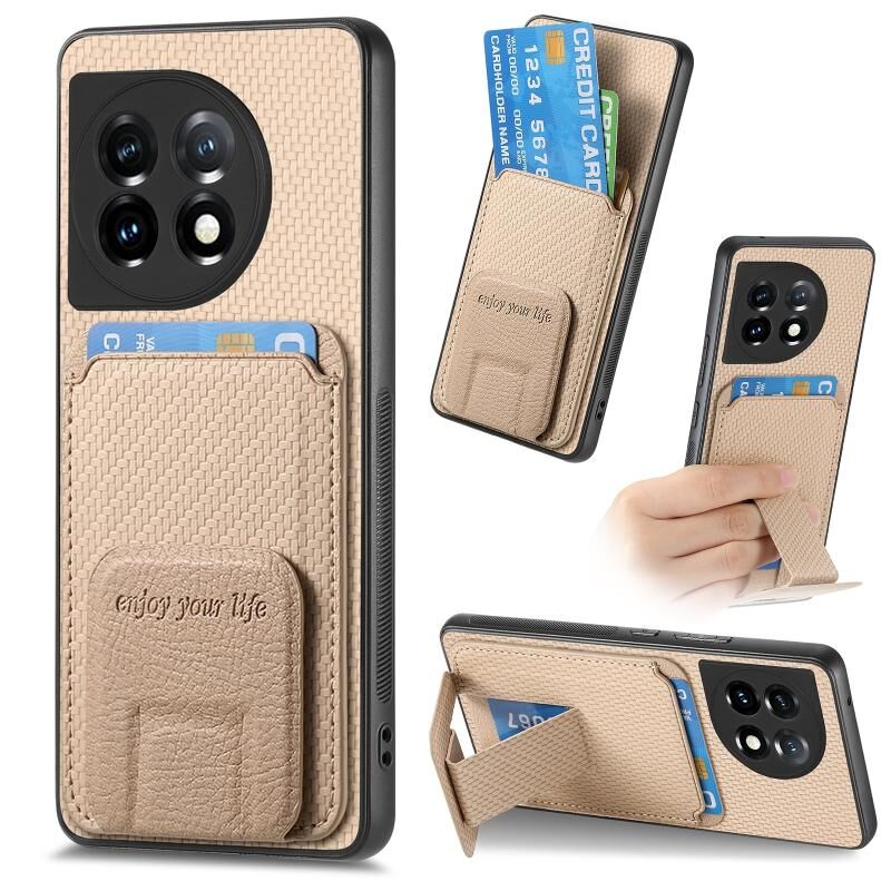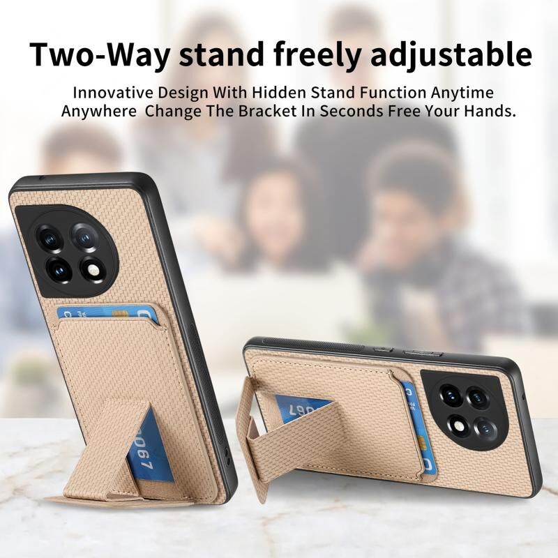 For OnePlus 12 5G Carbon Fiber Card Bag Fold Stand Phone Case(Khaki)