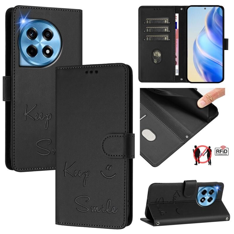 Για OnePlus 12 5G Παγκόσμια χαμόγελο ανάγλυφο RFID δερμάτινη θήκη τηλεφώνου (Μαύρο)