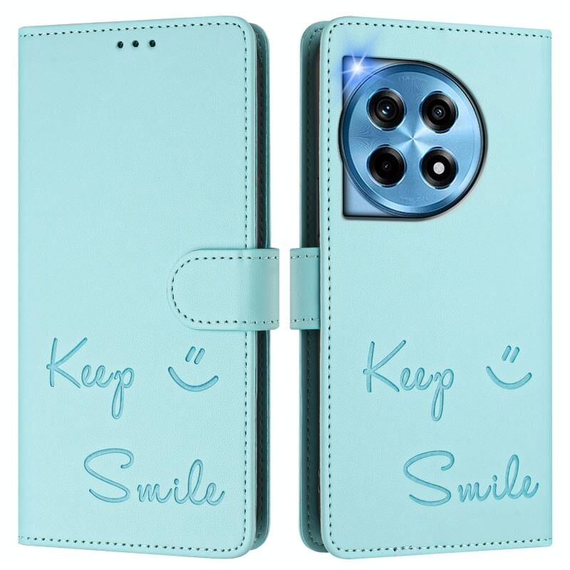 Για OnePlus 12 5G Παγκόσμια χαμόγελο ανάγλυφο RFID δερμάτινη θήκη τηλεφώνου (πράσινο χρώμα)