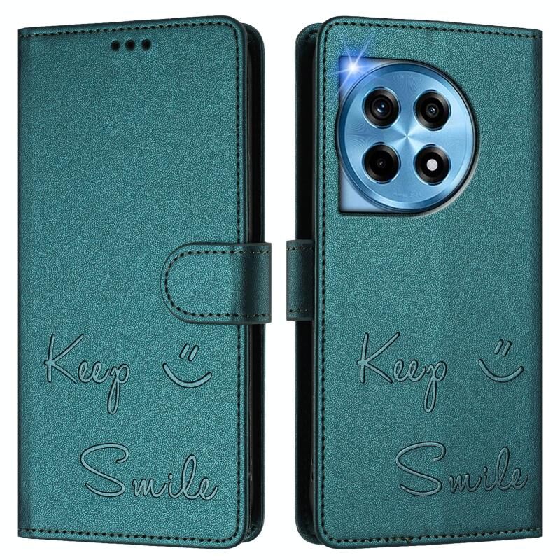 Για OnePlus 12 5G Παγκόσμια Smile ανάγλυφο RFID δερμάτινη θήκη τηλεφώνου (Peacock Green)