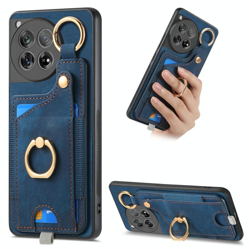Για OnePlus 12 5G Ρετρό δέρμα αίσθηση δαχτυλίδι κάρτα τσάντα υπόθεση τηλεφώνου με Hang Loop (μπλε)