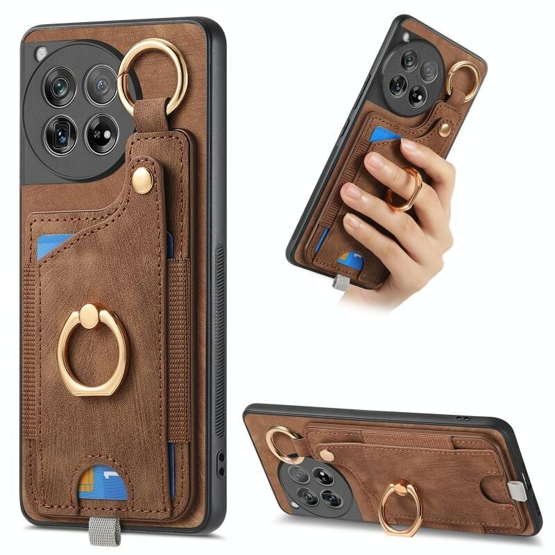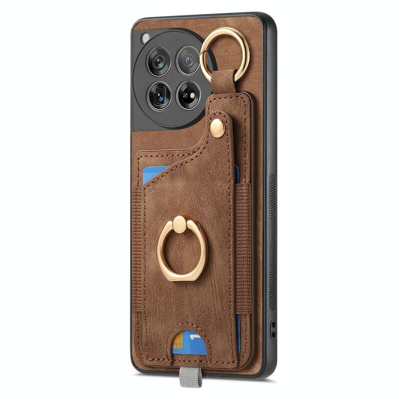 Για OnePlus 12 5G Ρετρό δέρμα αίσθηση δαχτυλίδι κάρτα τσάντα υπόθεση τηλεφώνου με Hang Loop (καφέ)
