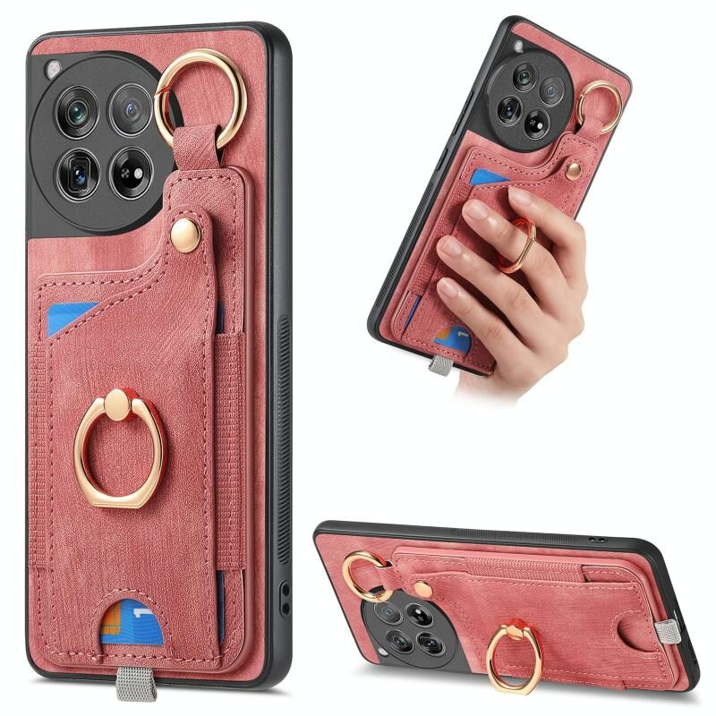 Για OnePlus 12 5G Ρετρό δέρμα αίσθηση δαχτυλίδι κάρτα τσάντα υπόθεση τηλεφώνου με Hang Loop (ροζ)