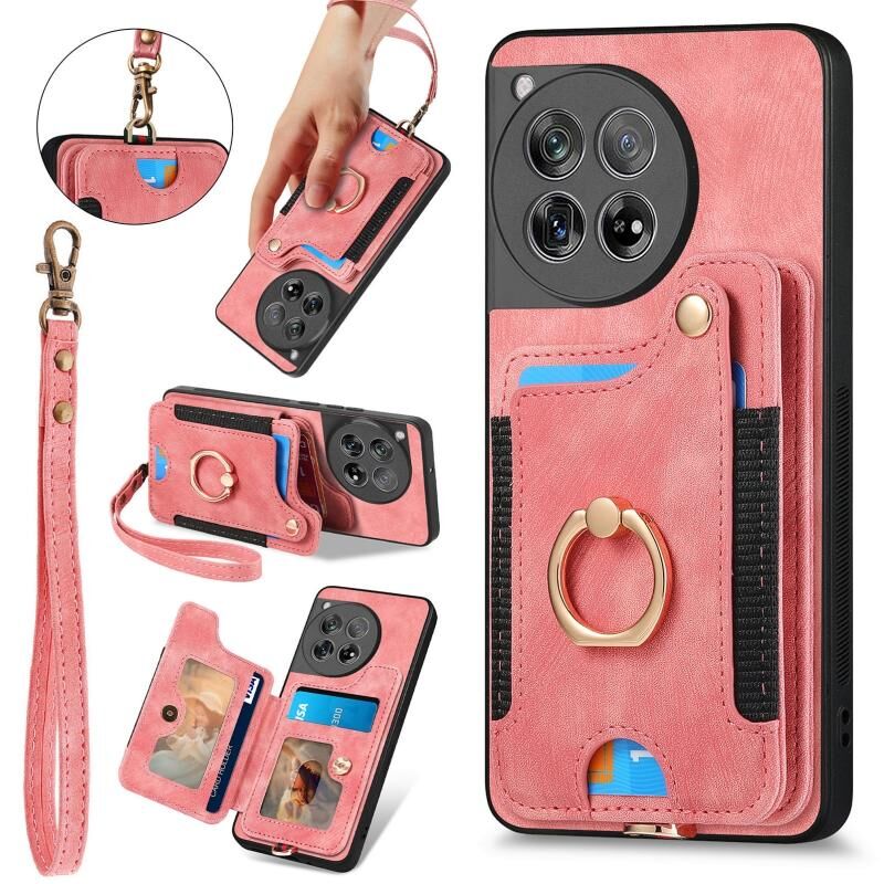 Για OnePlus 12 5G Ρετρό δέρμα αίσθηση δαχτυλίδι πολυ-κάρτα RFID πορτοφόλι υπόθεση τηλεφώνου (ροζ)