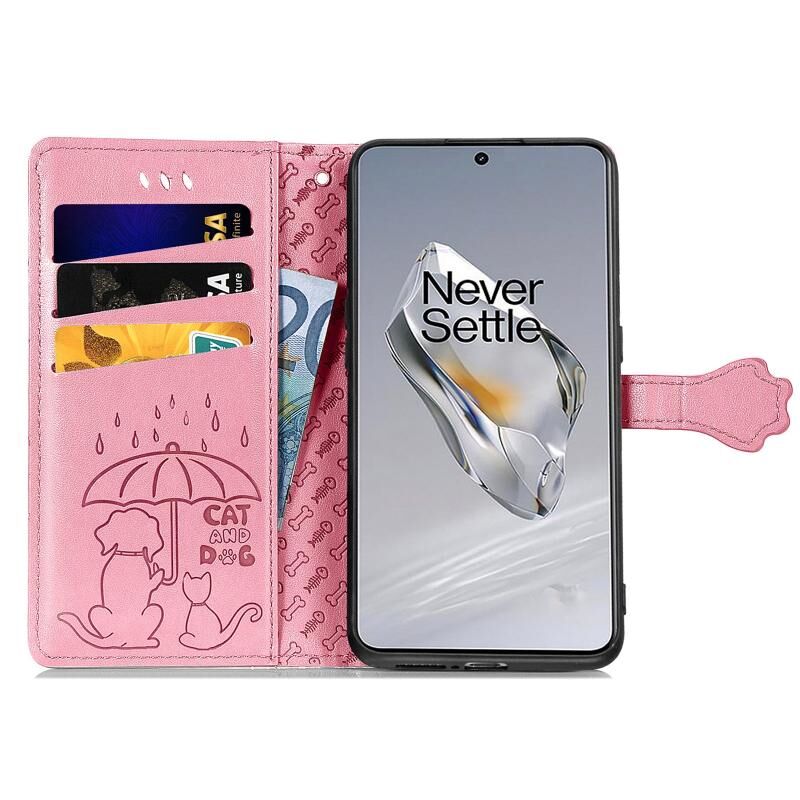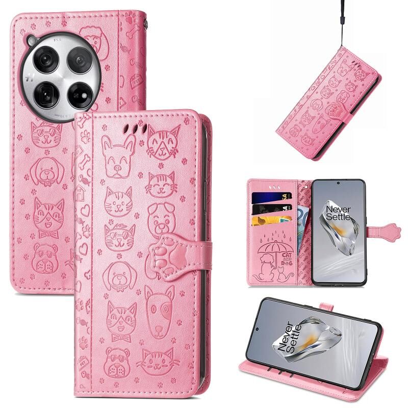 Θήκη τηλεφώνου από δέρμα με ανάγλυφο σχέδιο γάτας και σκύλου για OnePlus 12 (Γκρι)