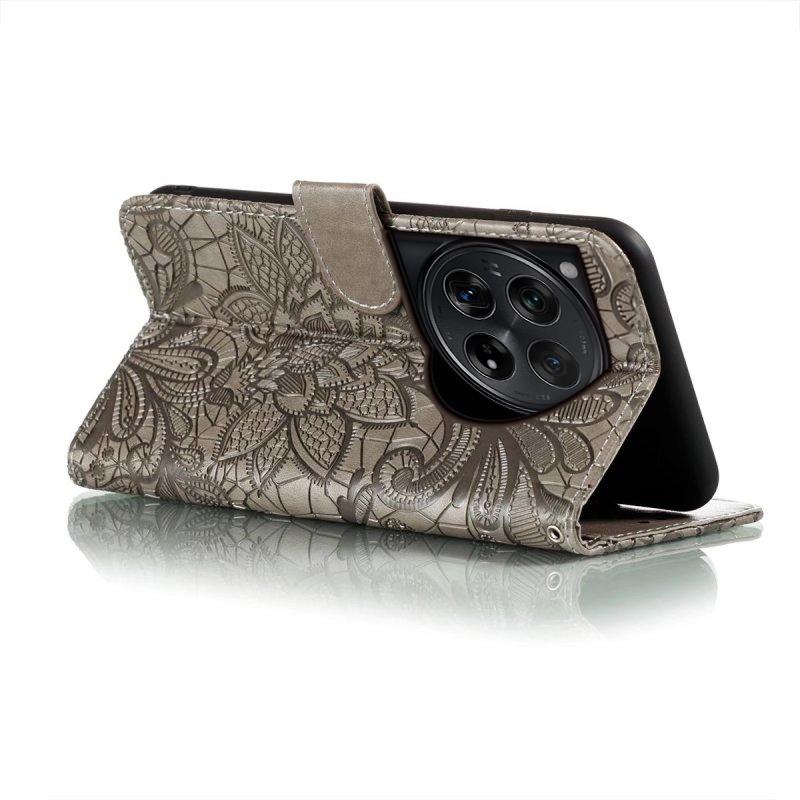 For OnePlus 12 Lace Flower Embossing Flip Leather Phone Case(Grey)