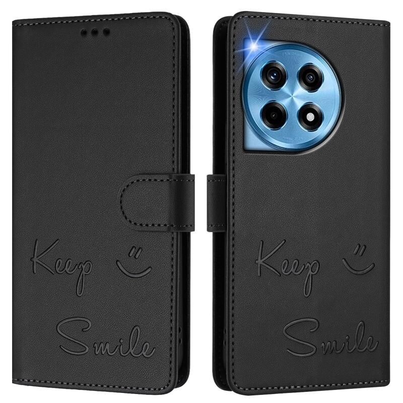 Για OnePlus 12R 5G Παγκόσμια χαμόγελο ανάγλυφο RFID δερμάτινη θήκη τηλεφώνου (Μαύρο)