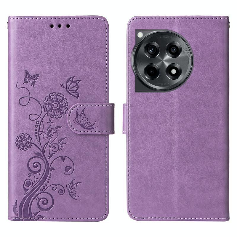 Θήκη τηλεφώνου από δέρμα με ανάγλυφα σχέδια πεταλούδας και λουλουδιών για OnePlus 12R / Ace 3 5G (Μωβ)