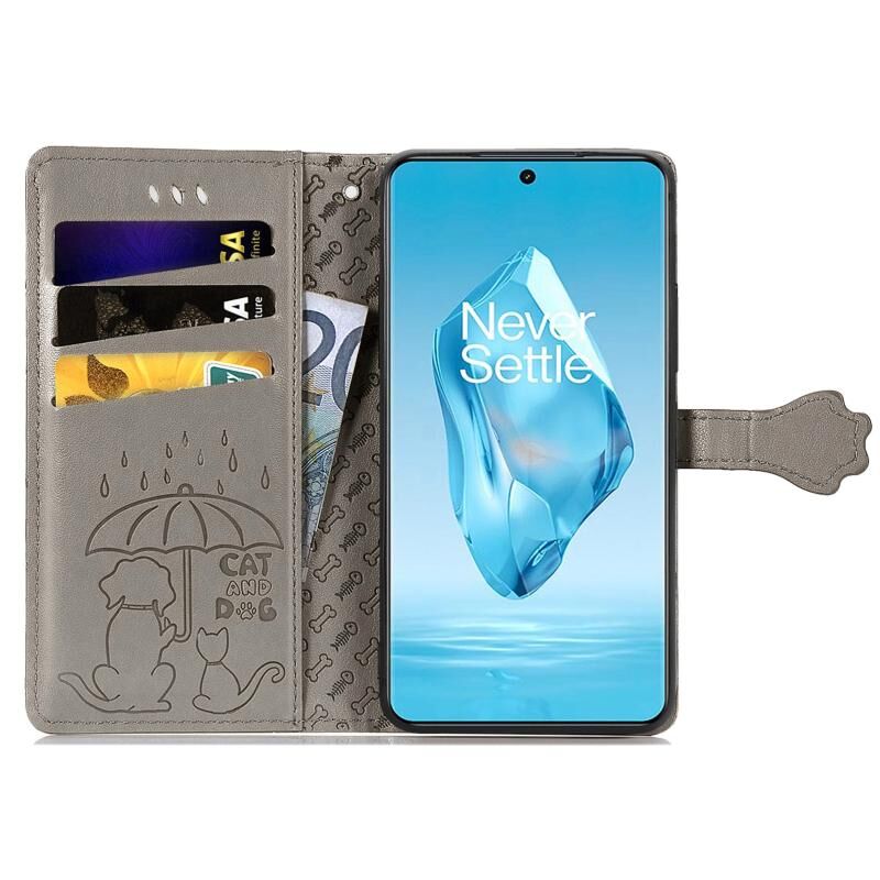 Θήκη τηλεφώνου από δέρμα με ανάγλυφο σχέδιο γάτας και σκύλου για OnePlus 12R (Γκρι)