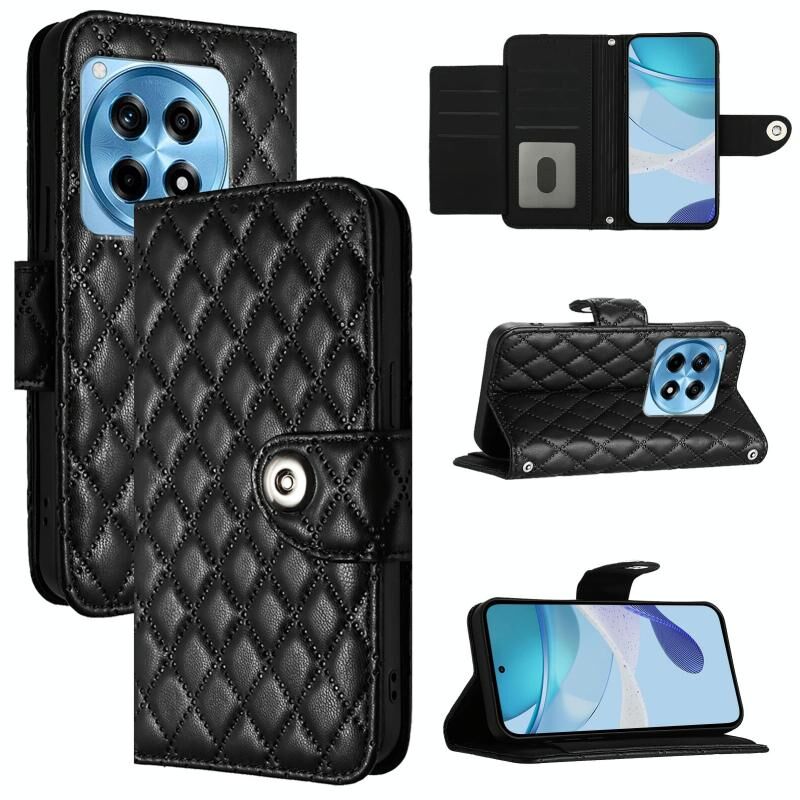 Για OnePlus 12R Rhombic υφή Flip δερμάτινη θήκη τηλεφώνου με κορδόνι (Μαύρο)