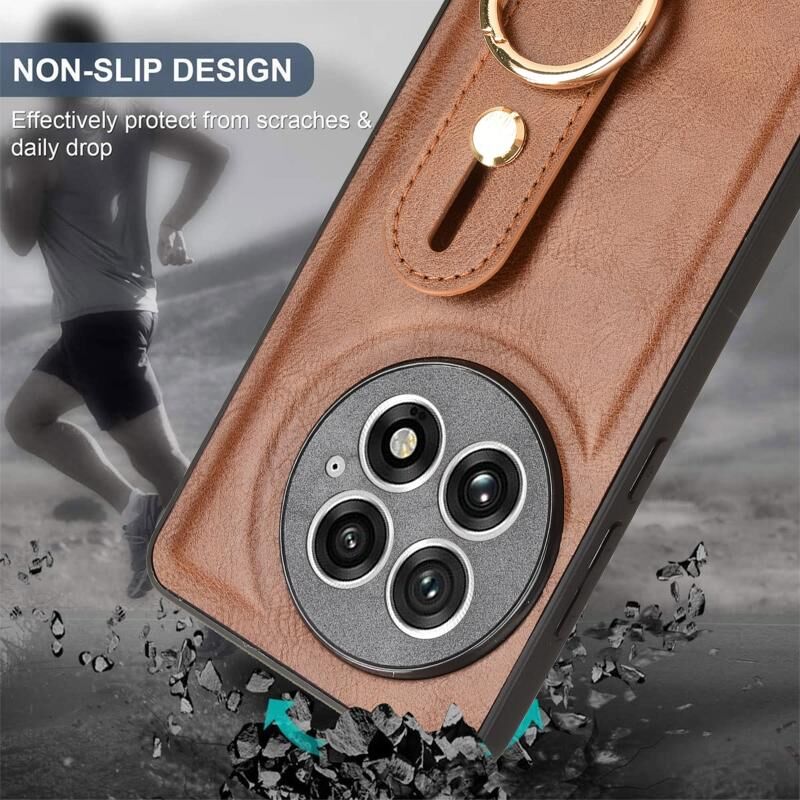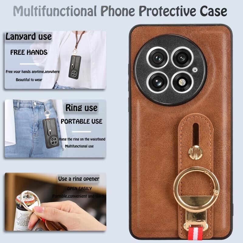 Για OnePlus 13 Wristband δέρμα πίσω τηλέφωνο υπόθεση (καφέ)