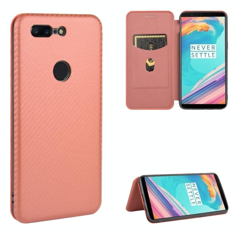Για OnePlus 5T Carbon Fiber υφή οριζόντια Flip TPU + PC + PU δερμάτινη θήκη με υποδοχή κάρτας (καφέ)