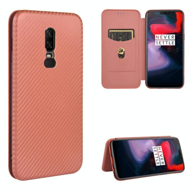 Για OnePlus 6 Carbon Fiber υφή οριζόντια Flip TPU + PC + PU δερμάτινη θήκη με υποδοχή κάρτας (καφέ)