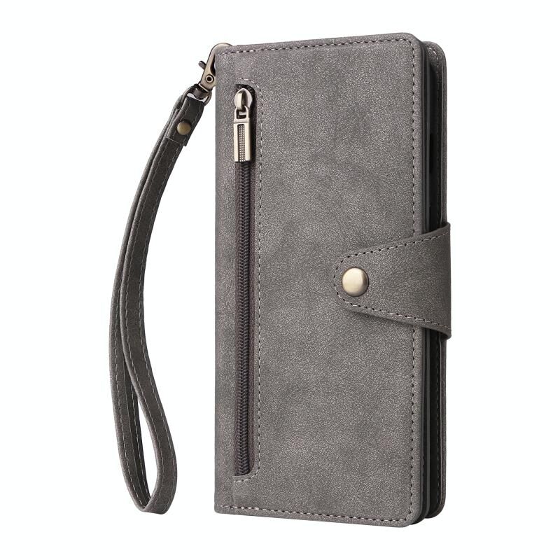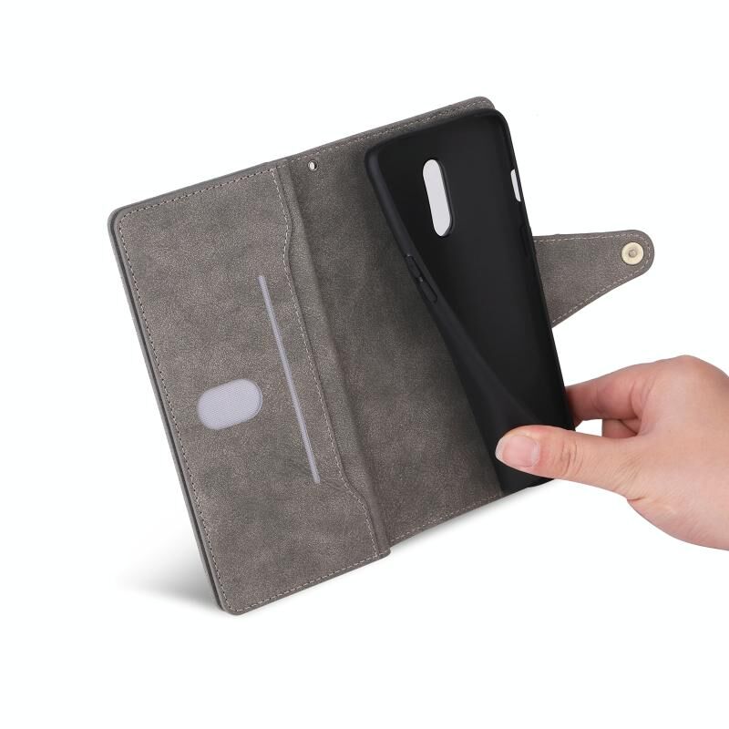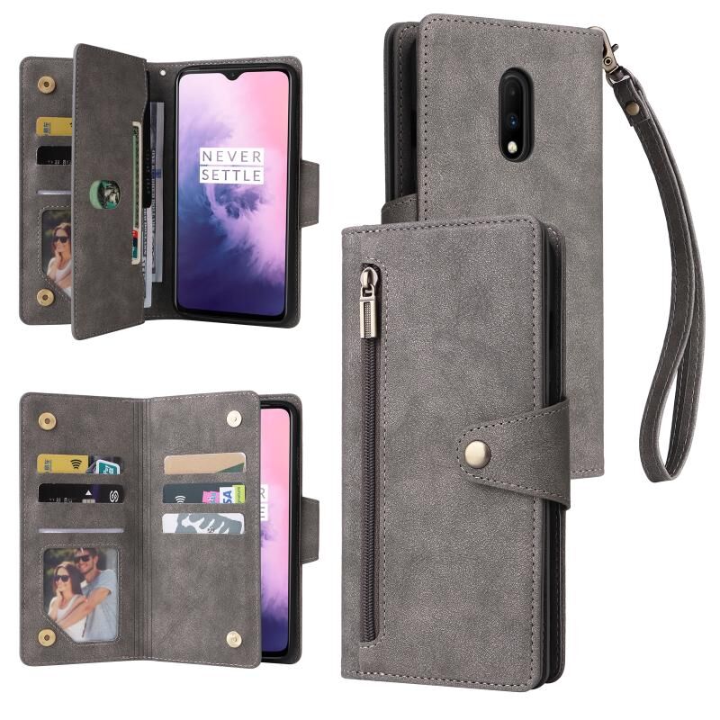 Για OnePlus 7 Rivet πόρπη 9 κάρτες τρεις φορές δερμάτινη θήκη τηλεφώνου (γκρι)