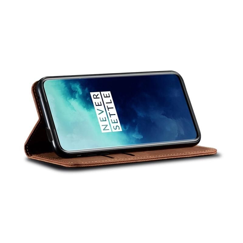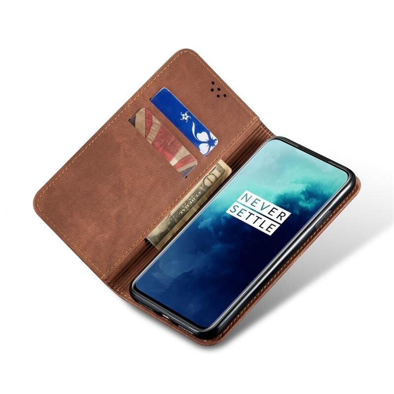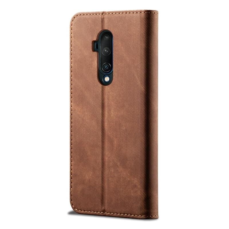 Για OnePlus 7T Pro Denim Υφή Casual Style Οριζόντια Flip δερμάτινη θήκη με κάτοχο & υποδοχές για κάρτες & πορτοφόλι (καφέ)