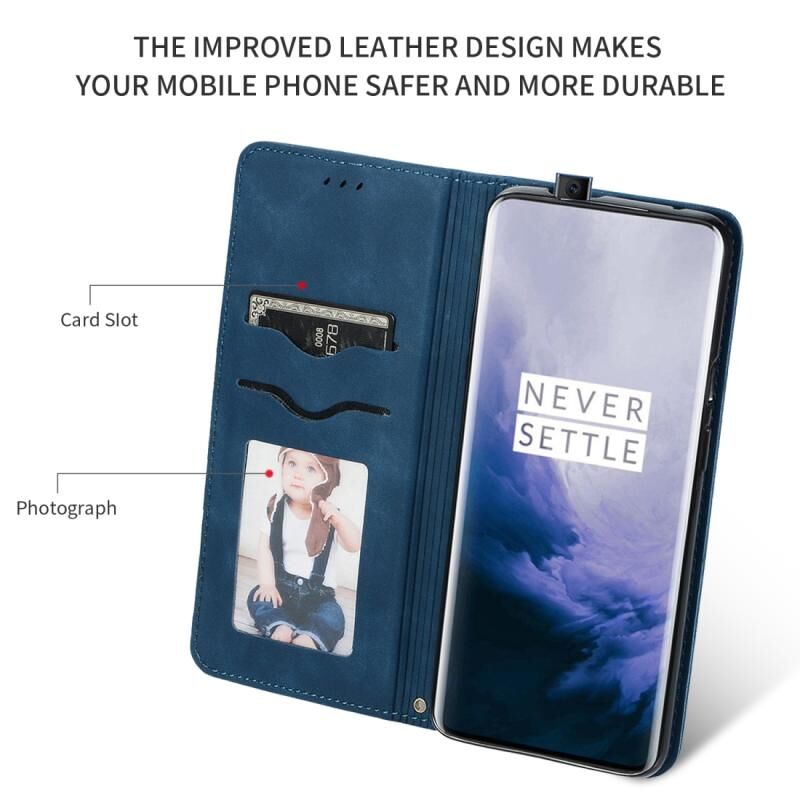 Για OnePlus 7T Pro Ρετρό δέρμα αίσθηση Business μαγνητική οριζόντια Flip δερμάτινη θήκη (Navy Blue)