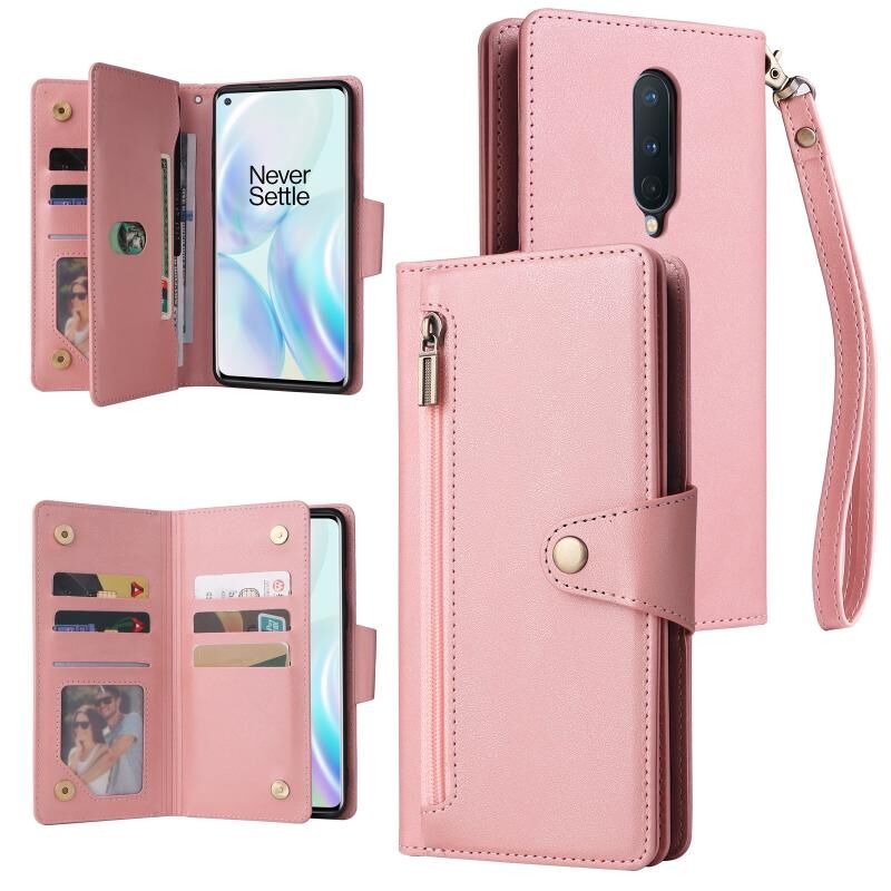 Για OnePlus 8 Rivet πόρπη 9 κάρτες τρεις φορές δερμάτινη θήκη τηλεφώνου (Rose Gold)