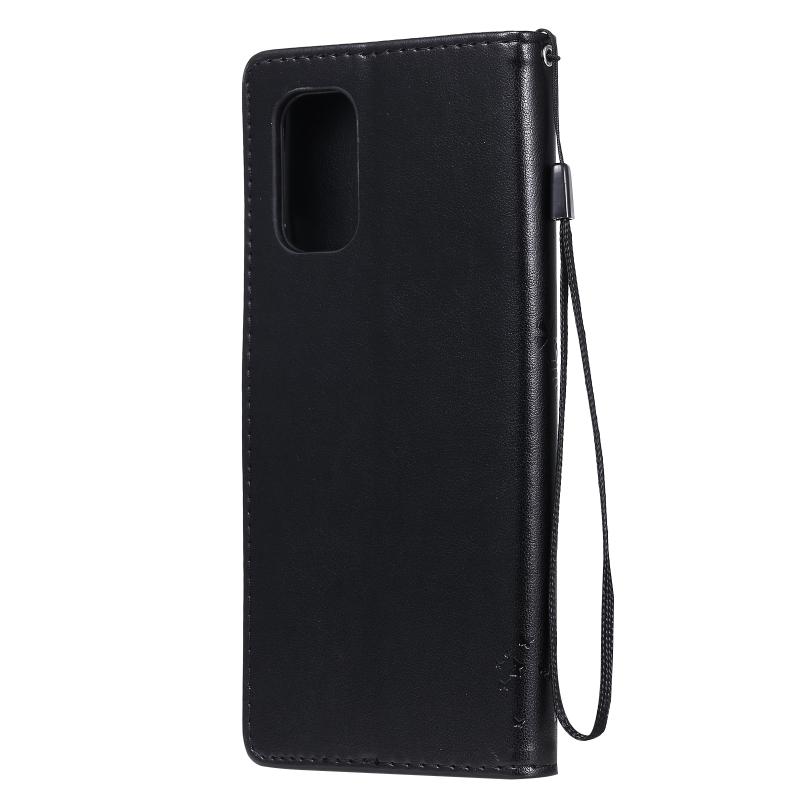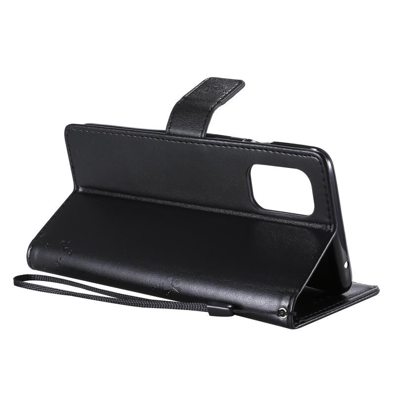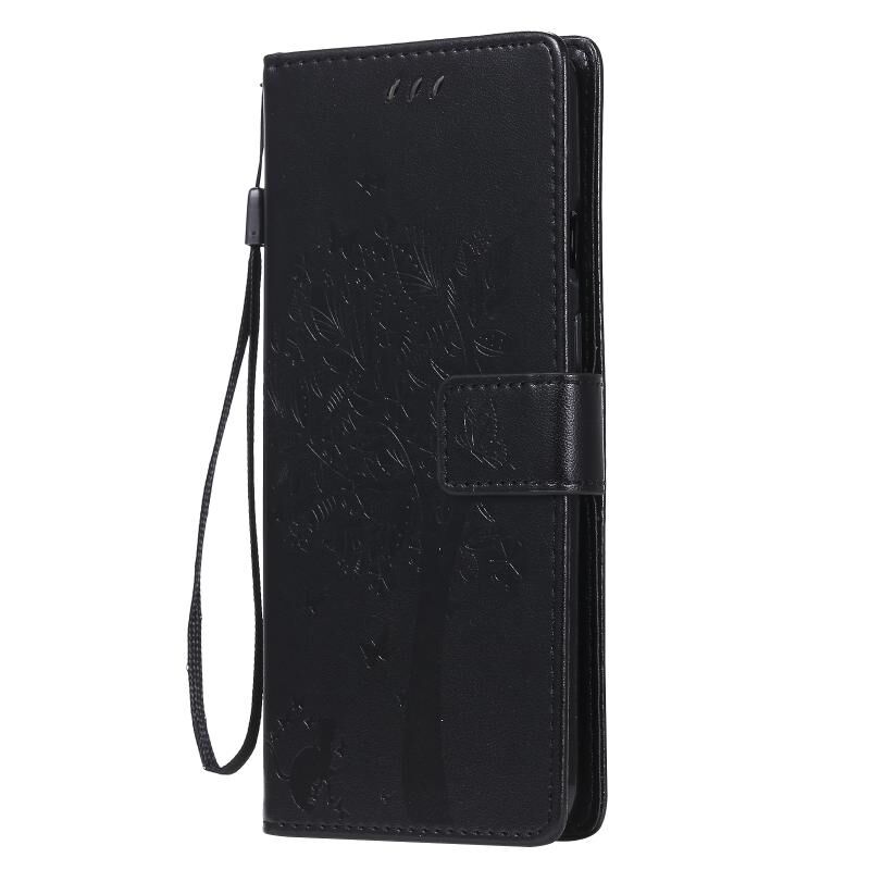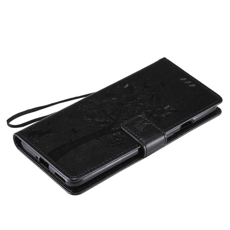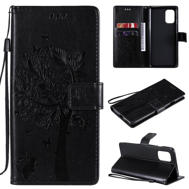 For OnePlus 8T Tree & Cat Pattern Pressed Printing Horizontal Flip PU Leather Case with Holder & Card Slots & Wallet & Lanyard(Black)