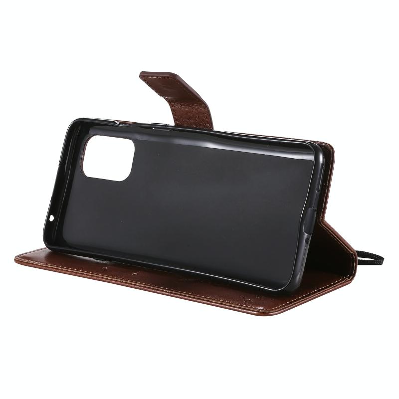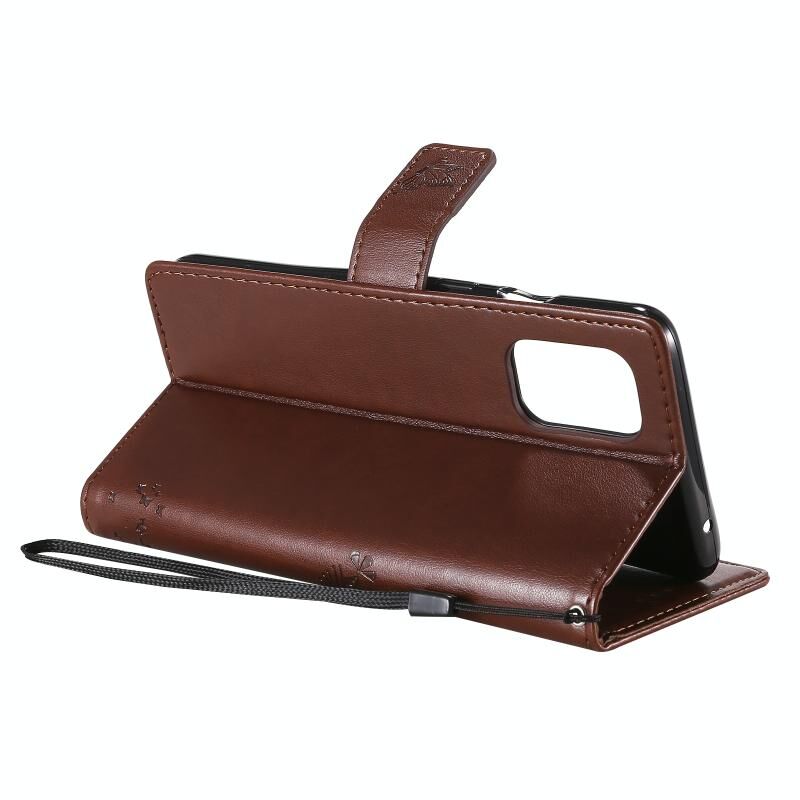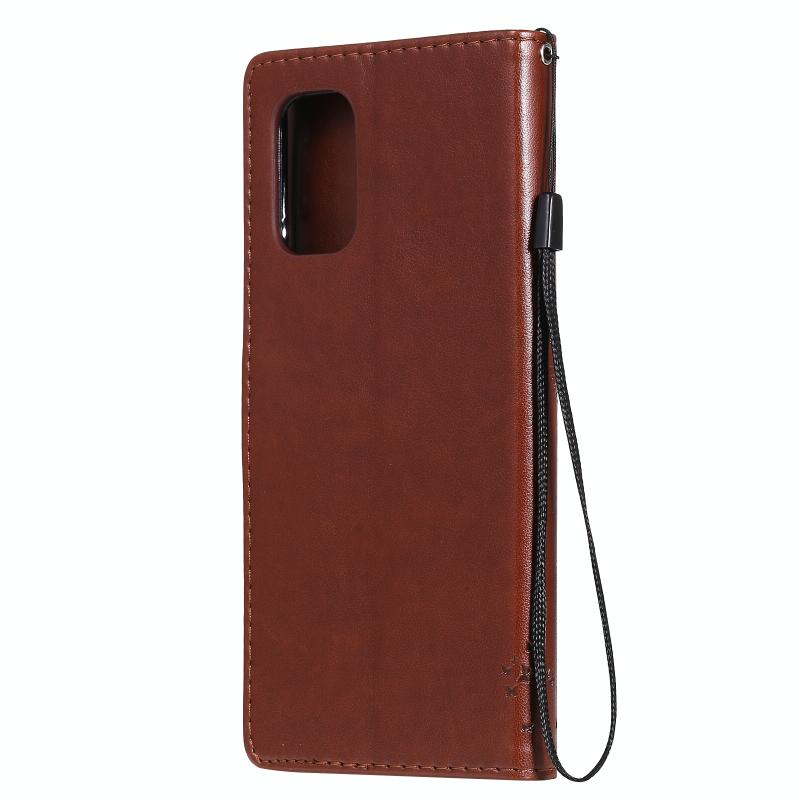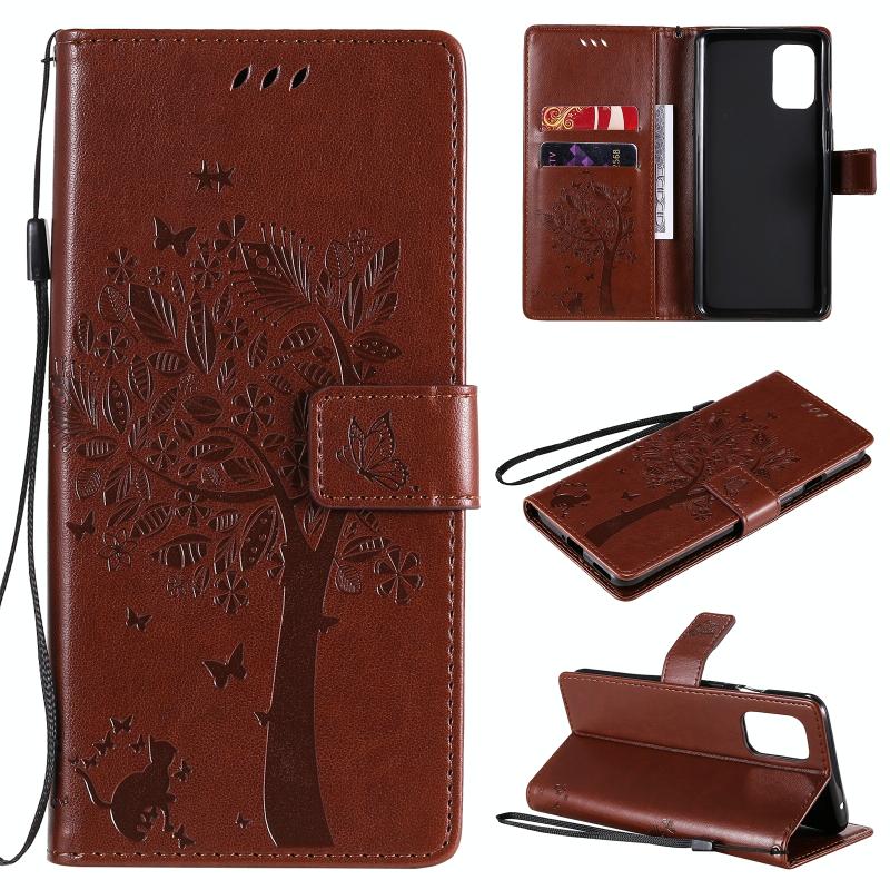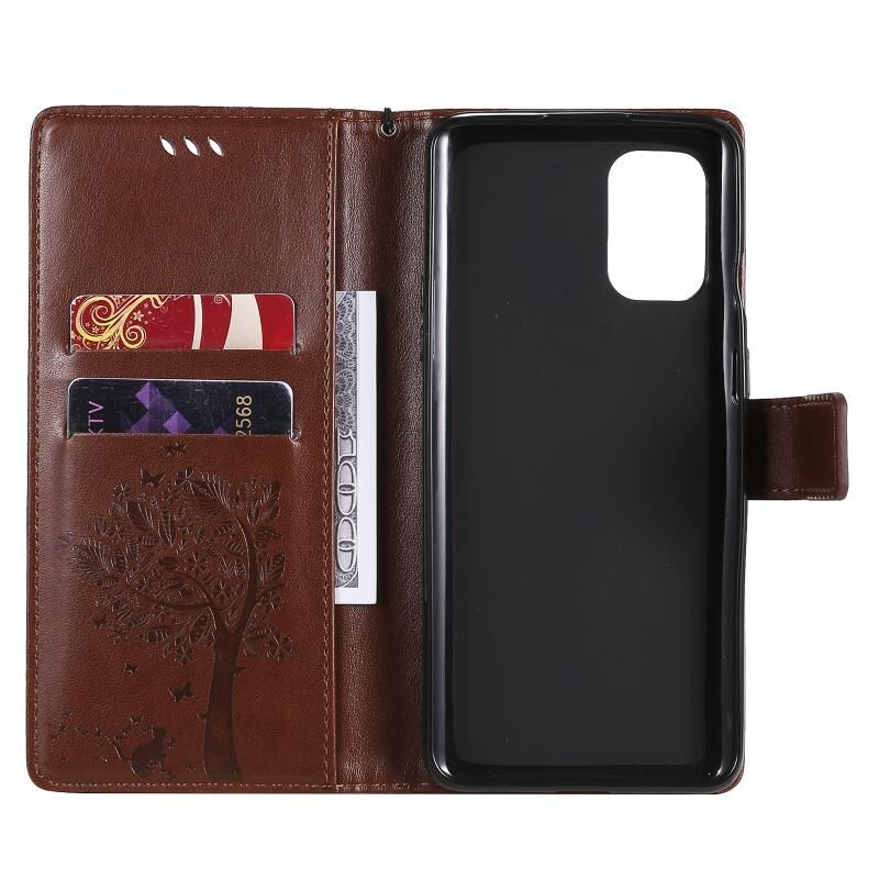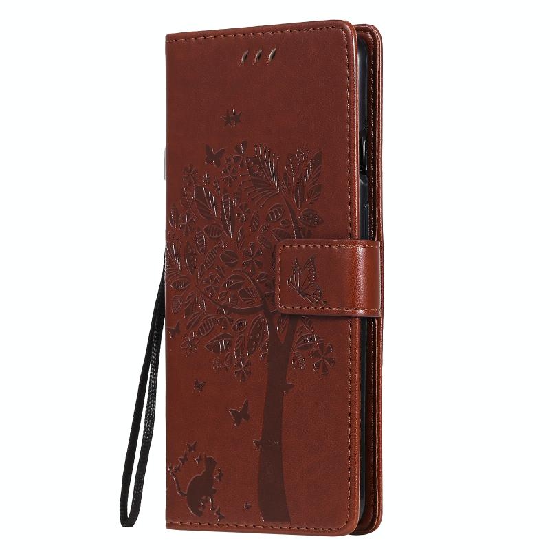 For OnePlus 8T Tree & Cat Pattern Pressed Printing Horizontal Flip PU Leather Case with Holder & Card Slots & Wallet & Lanyard(Coffee)