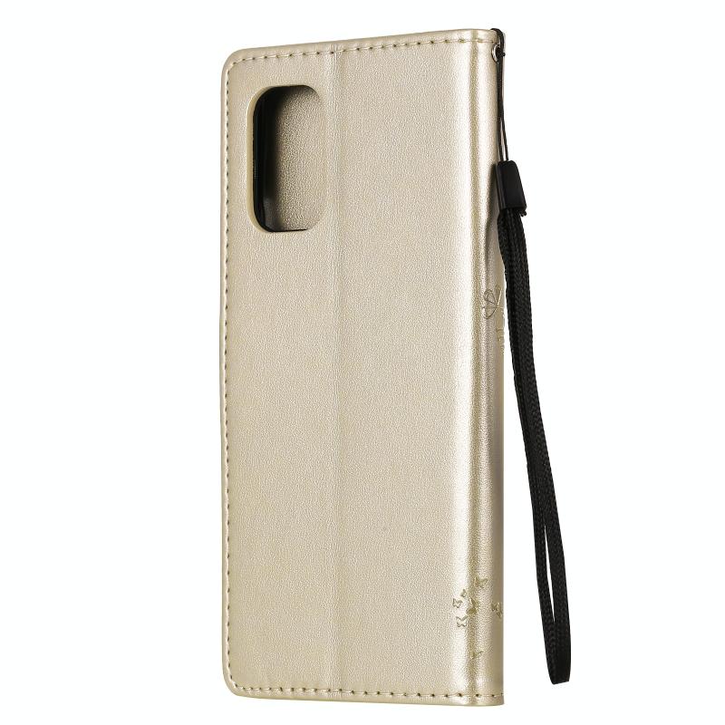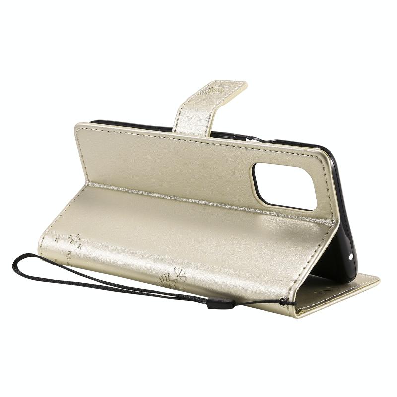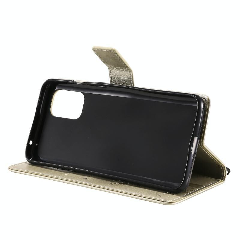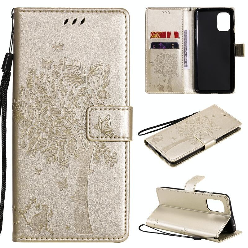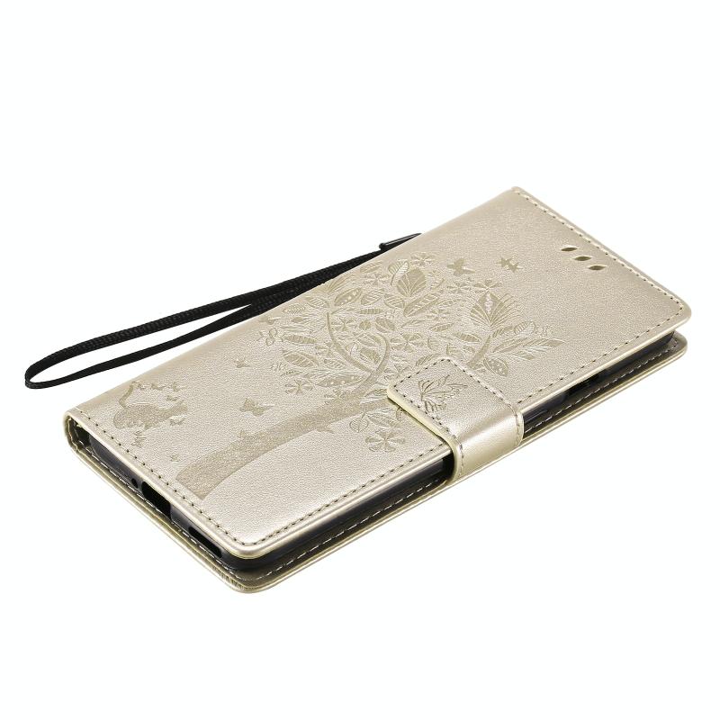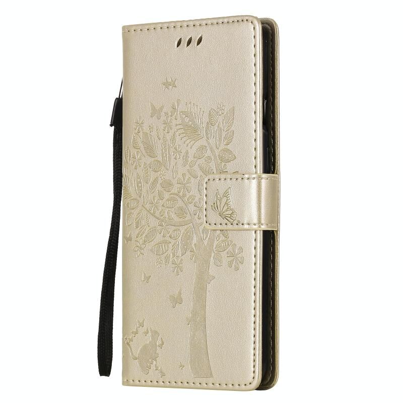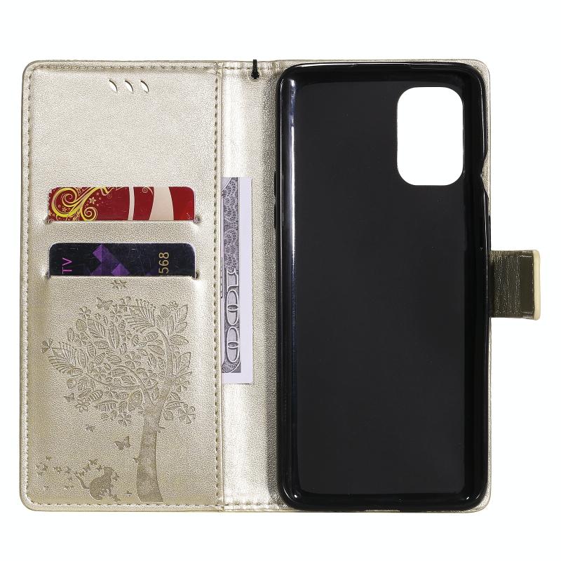 For OnePlus 8T Tree & Cat Pattern Pressed Printing Horizontal Flip PU Leather Case with Holder & Card Slots & Wallet & Lanyard(Gold)