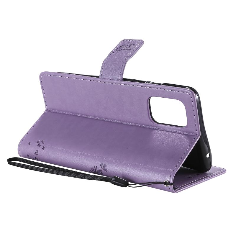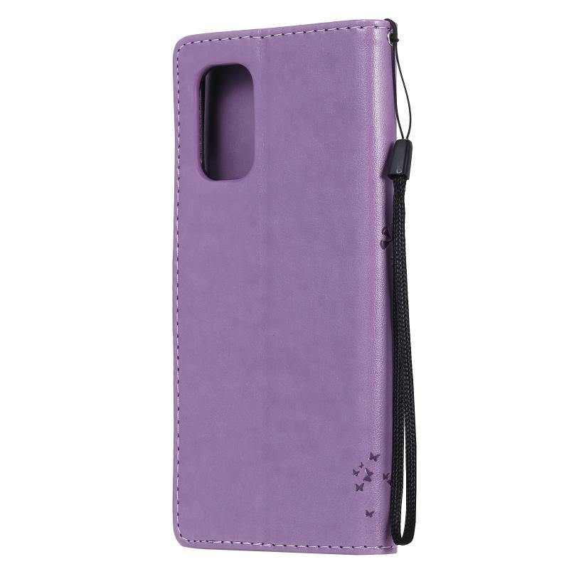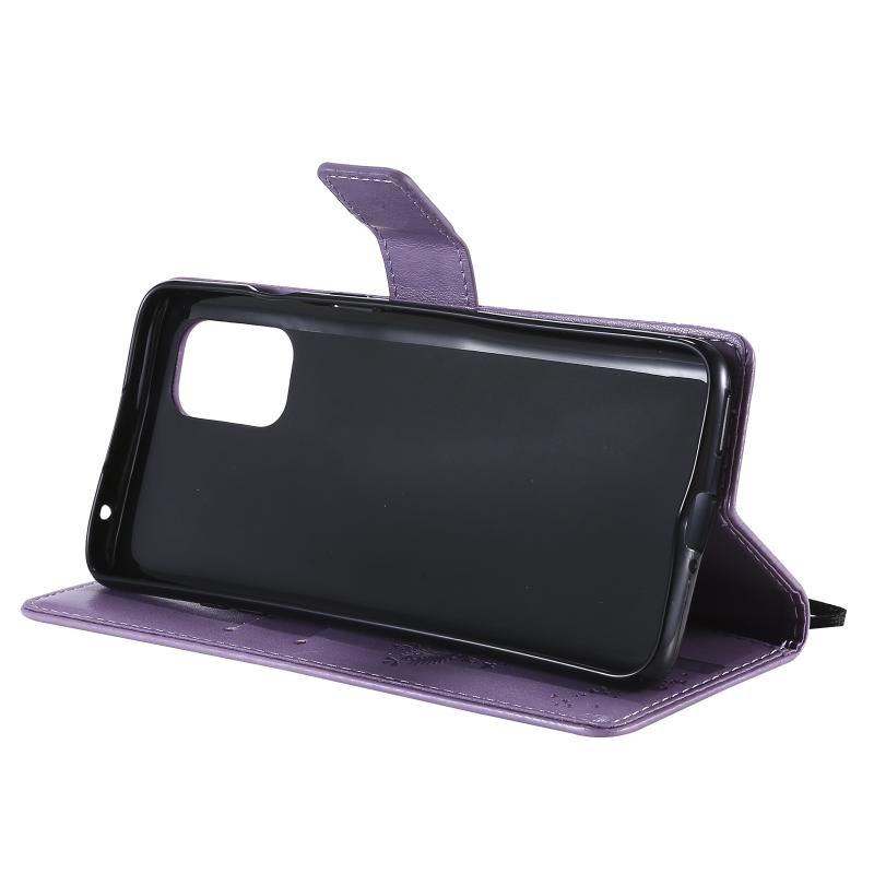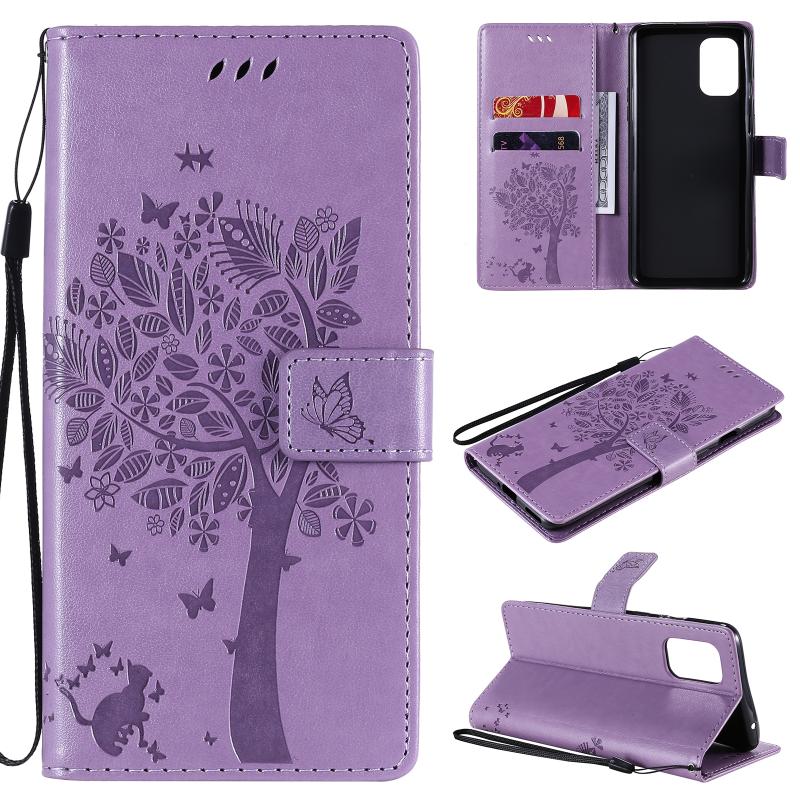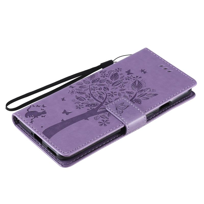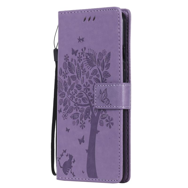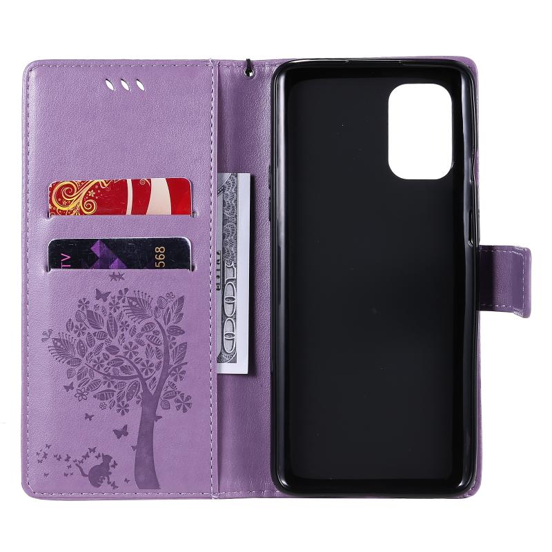 For OnePlus 8T Tree & Cat Pattern Pressed Printing Horizontal Flip PU Leather Case with Holder & Card Slots & Wallet & Lanyard(Light Purple)