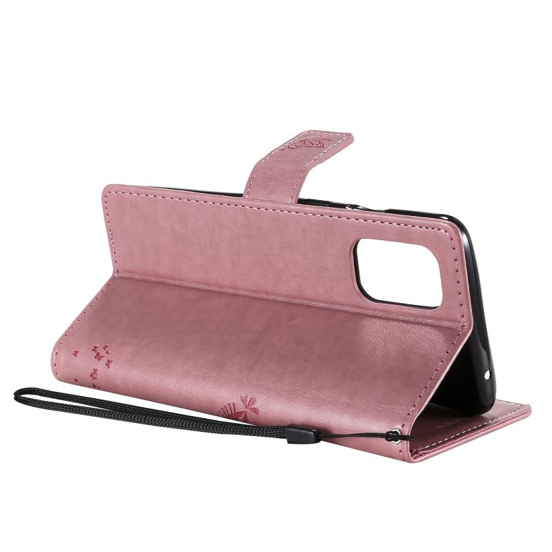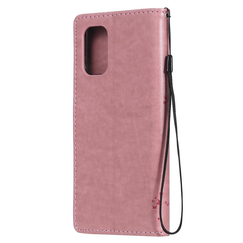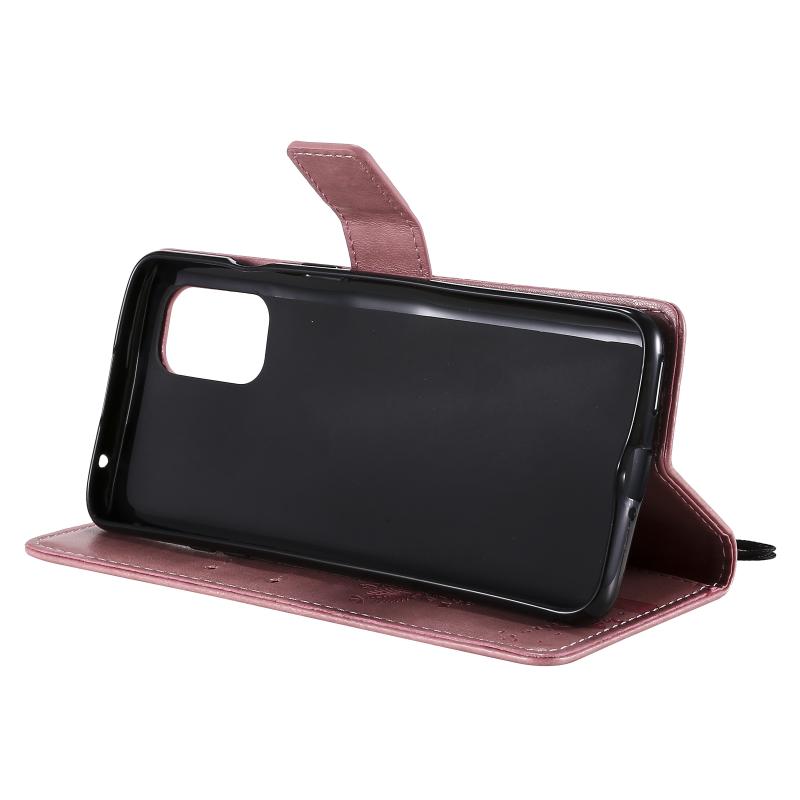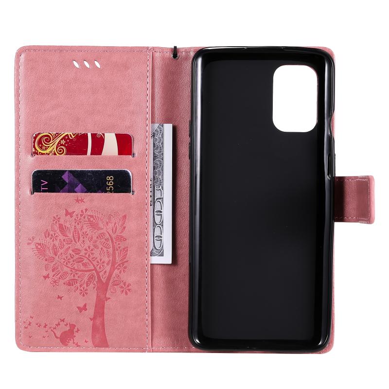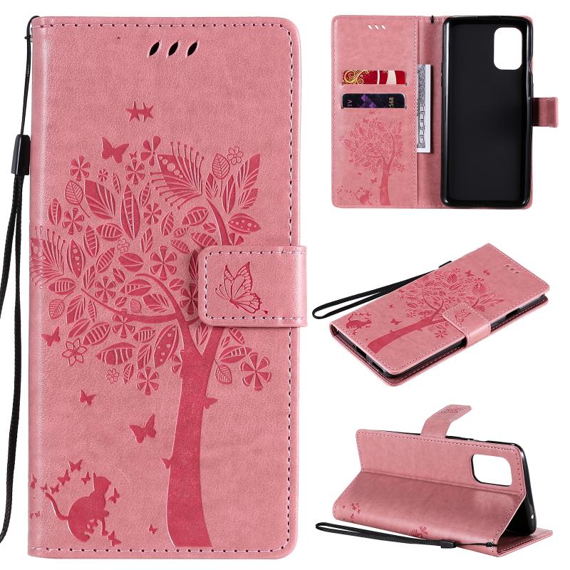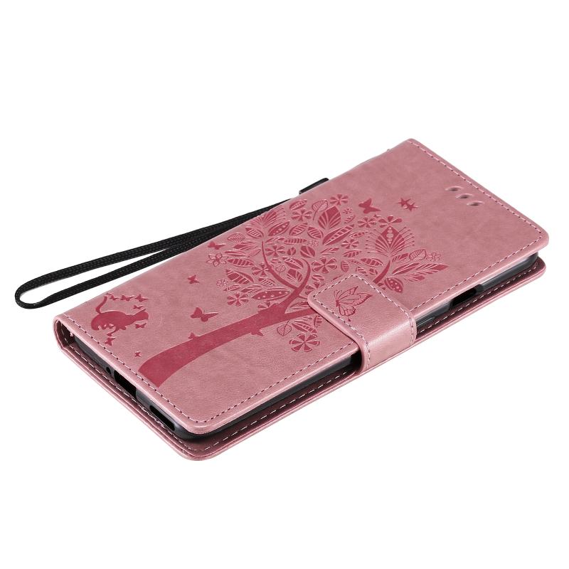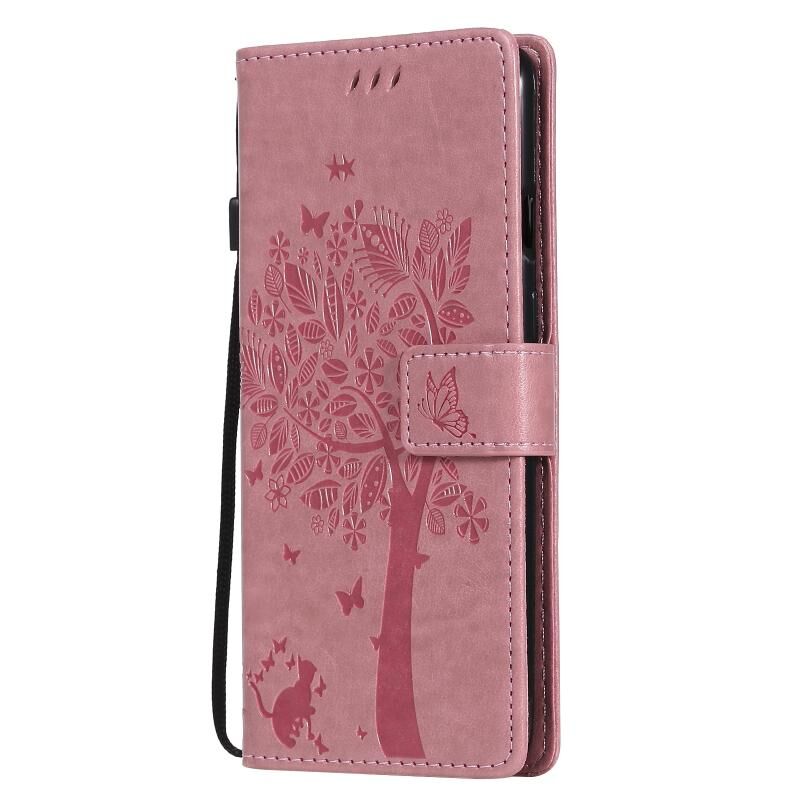 For OnePlus 8T Tree & Cat Pattern Pressed Printing Horizontal Flip PU Leather Case with Holder & Card Slots & Wallet & Lanyard(Pink)