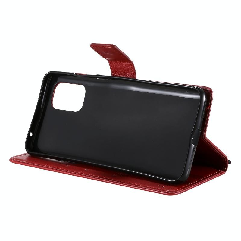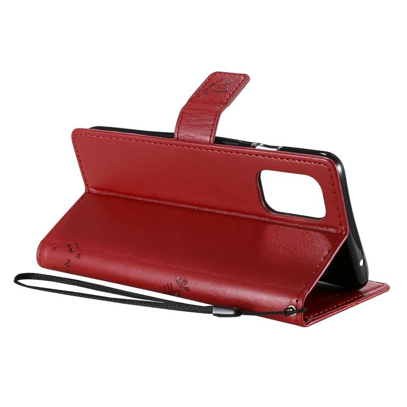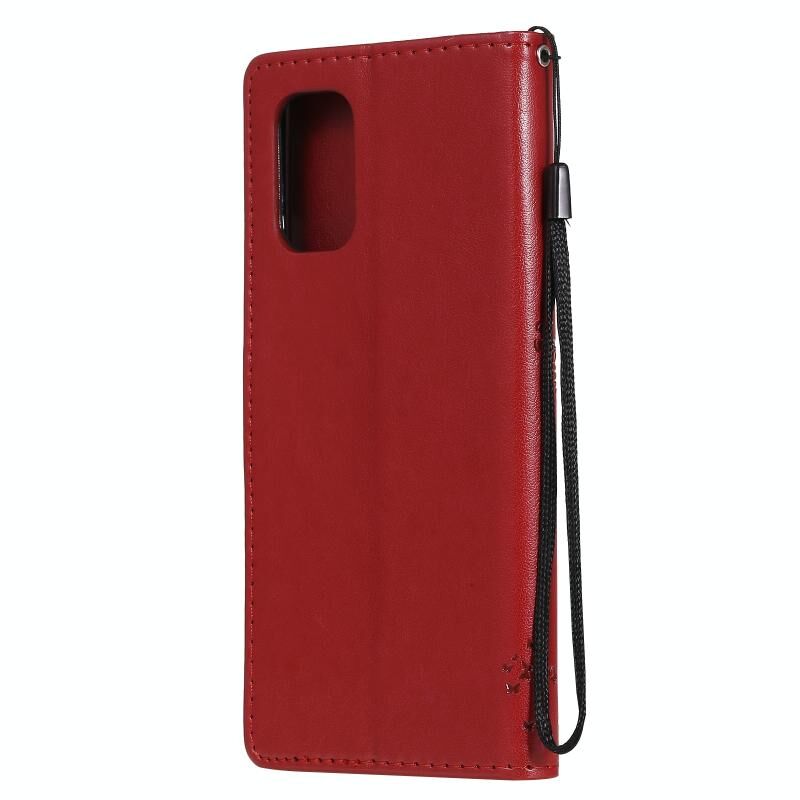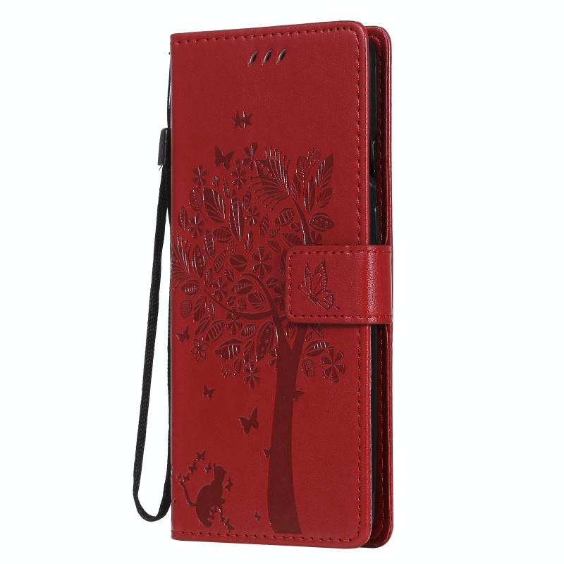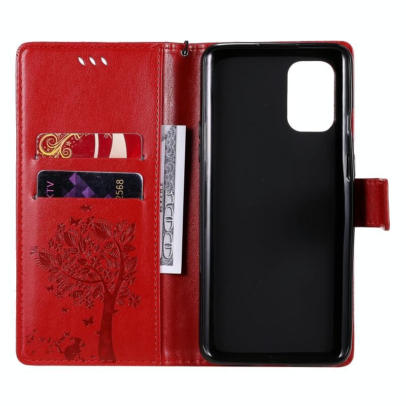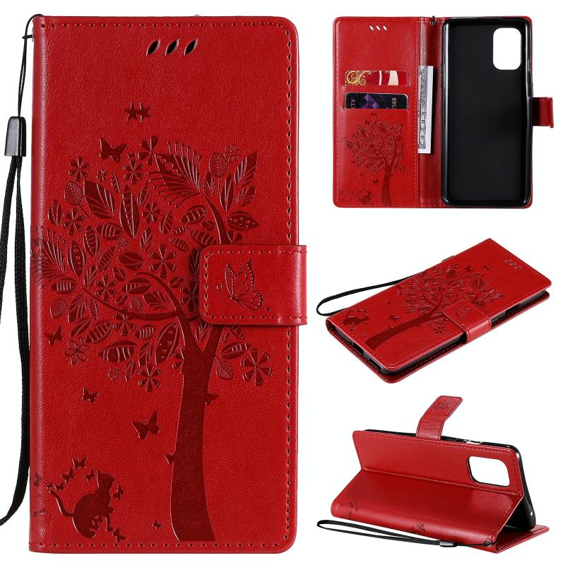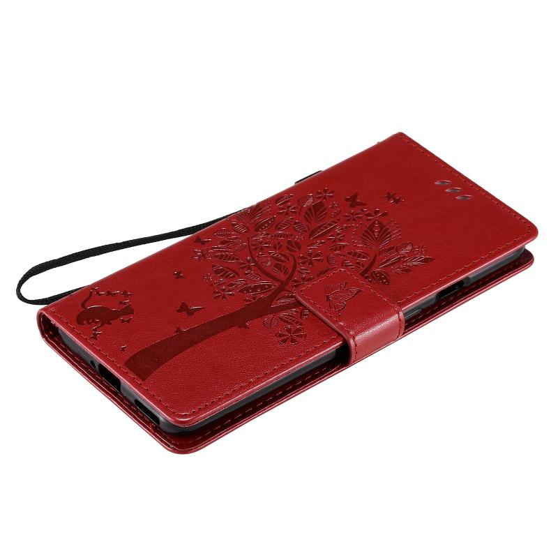 For OnePlus 8T Tree & Cat Pattern Pressed Printing Horizontal Flip PU Leather Case with Holder & Card Slots & Wallet & Lanyard(Red)