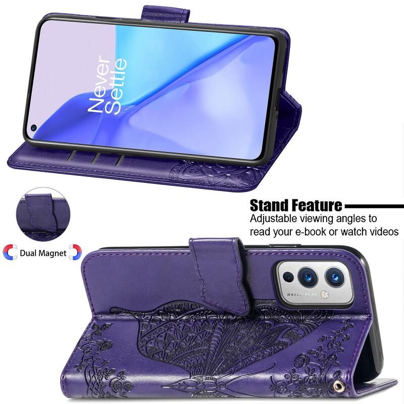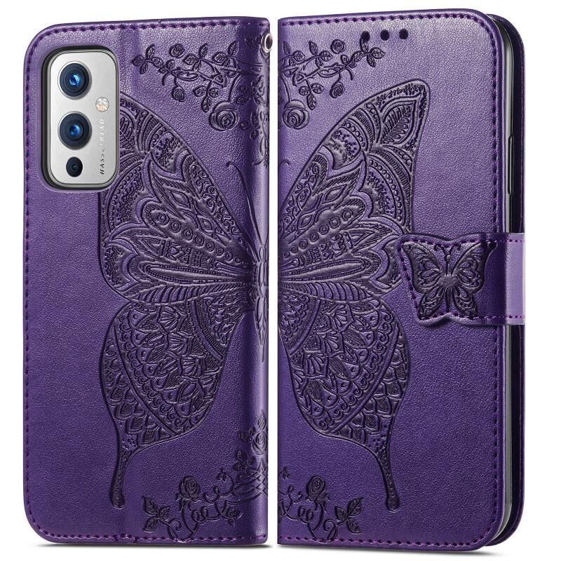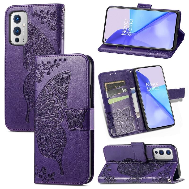 Για OnePlus 9 πεταλούδα αγάπη λουλούδια ανάγλυφο οριζόντια Flip δερμάτινη θήκη με κάτοχο & υποδοχές για κάρτες & πορτοφόλι & κορδόνι (σκούρο μοβ)