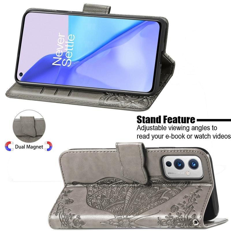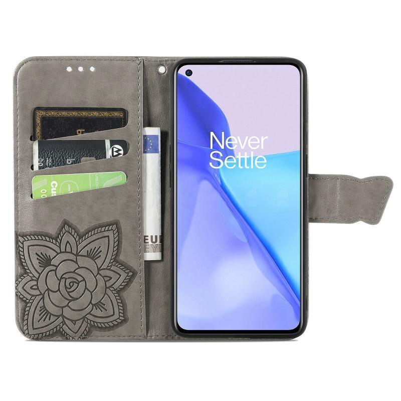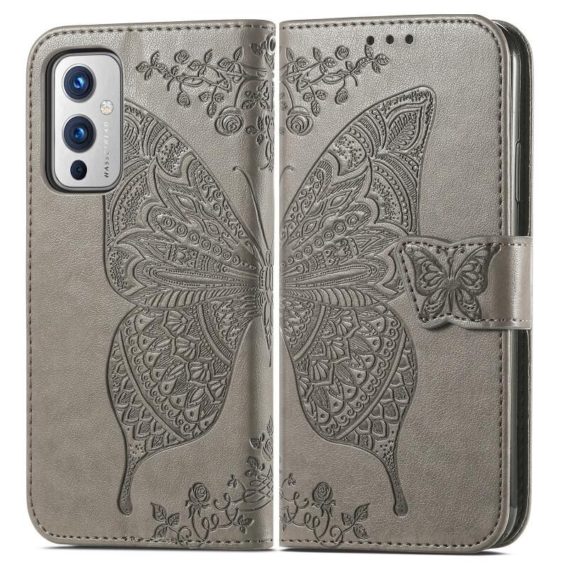 Για OnePlus 9 πεταλούδα αγάπη λουλούδια ανάγλυφο οριζόντια Flip δερμάτινη θήκη με κάτοχο & υποδοχές για κάρτες & πορτοφόλι & κορδόνι (γκρι)