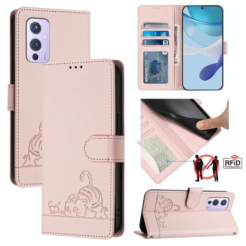 Θήκη τηλεφώνου από δέρμα με ανάγλυφο σχέδιο γάτας και αρουραίου για OnePlus 9 με λουρί (Μέντας Πράσινο)
