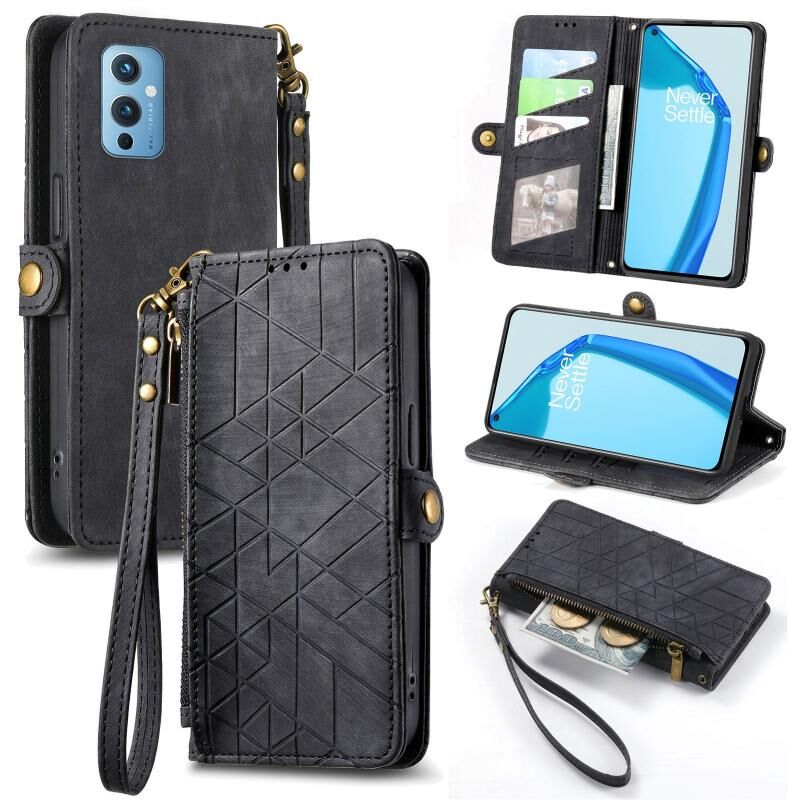 Για OnePlus 9 γεωμετρική φερμουάρ πορτοφόλι πλευρά πόρπη δερμάτινη θήκη τηλεφώνου (μαύρο)