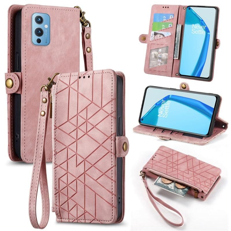 Για OnePlus 9 γεωμετρική φερμουάρ πορτοφόλι πλευρά πόρπη δερμάτινη θήκη τηλεφώνου (ροζ)