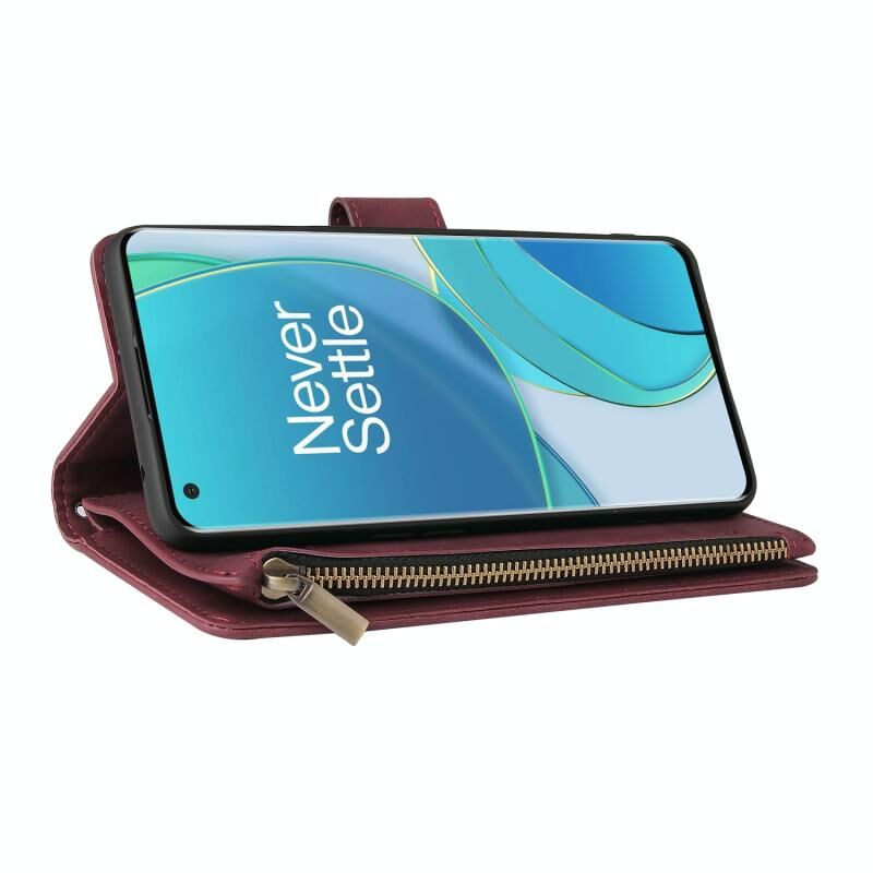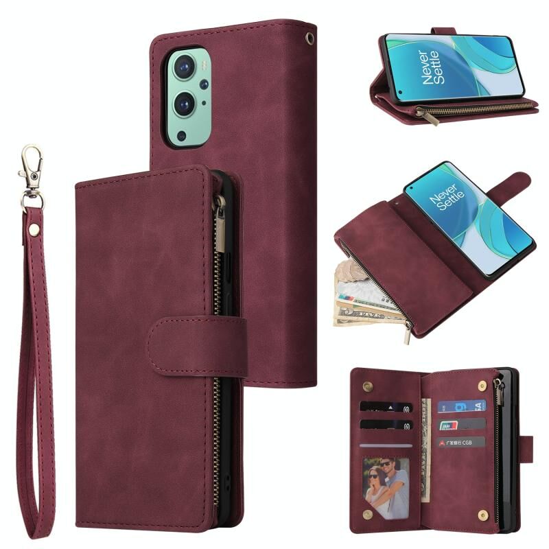 Για OnePlus 9 Πολυλειτουργικό παγωμένο φερμουάρ πορτοφόλι δερμάτινη θήκη τηλεφώνου (κόκκινο κρασί)