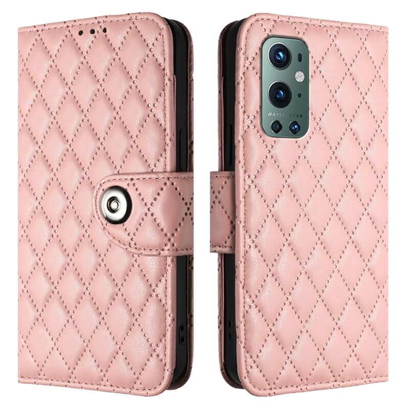 Για OnePlus 9 Pro Rhombic Texture Flip υπόθεση τηλεφώνου δέρμα με κορδόνι (Coral Pink)