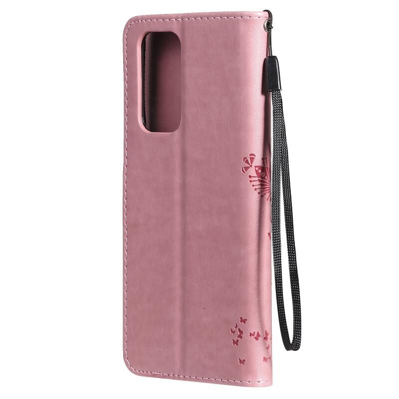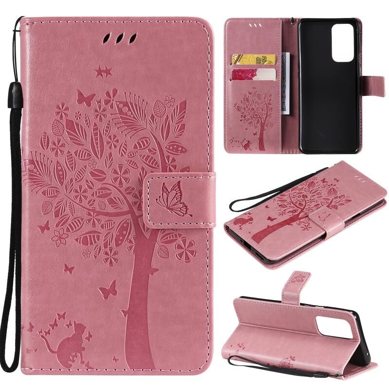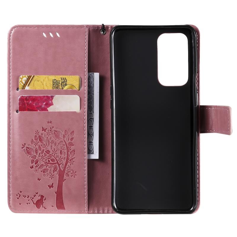 Για OnePlus 9 Pro Tree & Cat Pattern Pressed εκτύπωση οριζόντια Flip PU δερμάτινη θήκη με κάτοχο & υποδοχές για κάρτες & πορτοφόλι & κορδόνι (ροζ)
