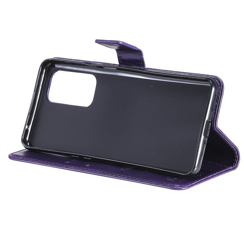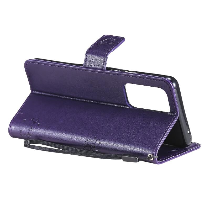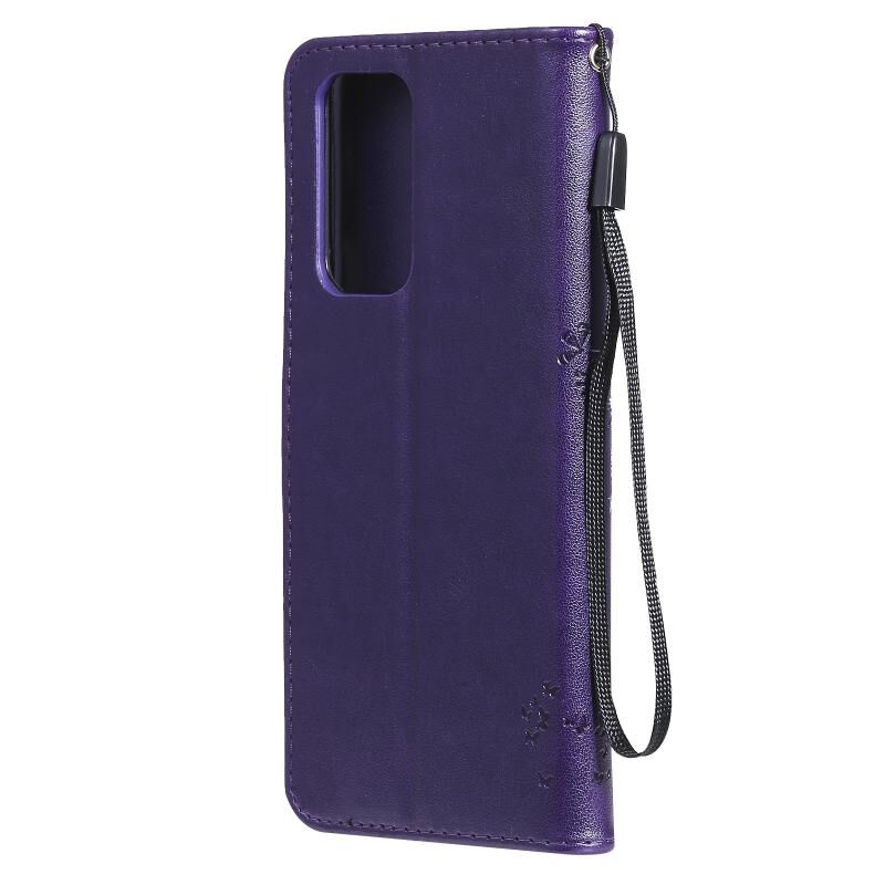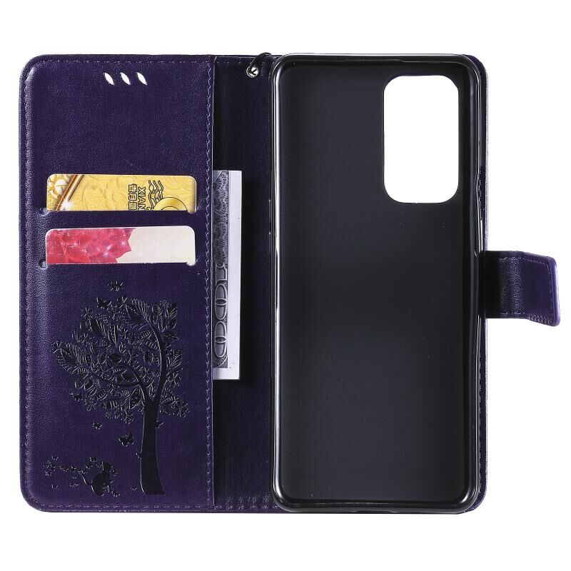 Για OnePlus 9 Pro Tree & Cat Pattern Pressed εκτύπωση οριζόντια Flip PU δερμάτινη θήκη με κάτοχο & υποδοχές για κάρτες & πορτοφόλι & κορδόνι (μωβ)
