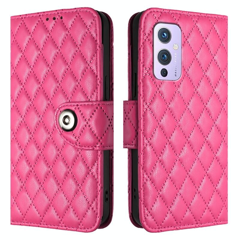 Για OnePlus 9 Rhombic υφή Flip υπόθεση τηλεφώνου δέρμα με κορδόνι (Rose Red)