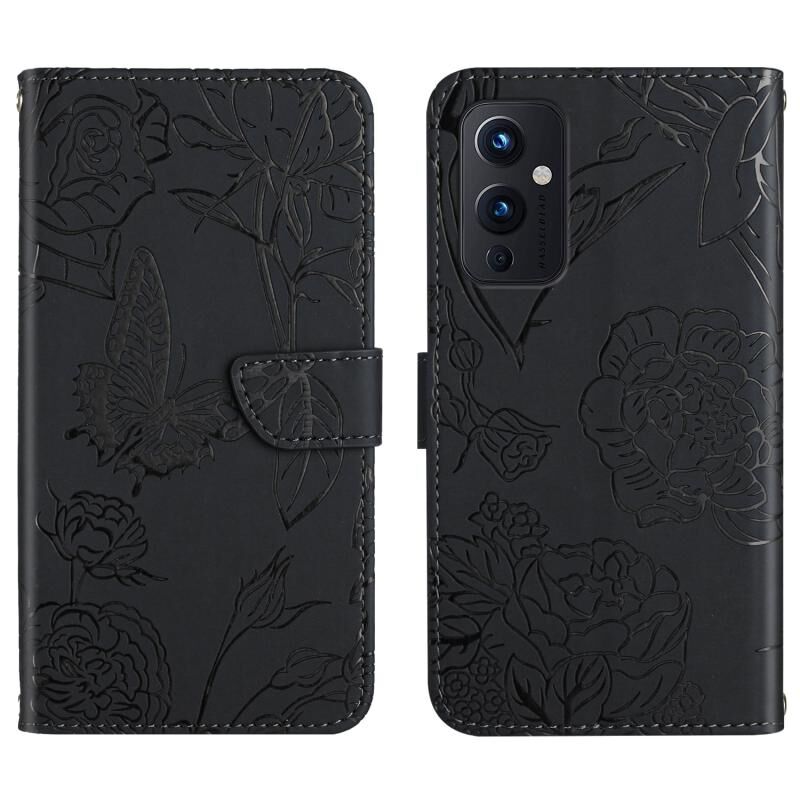 Θήκη τηλεφώνου OnePlus 9 με δέρμα ανάγλυφο, με σχέδιο πεταλούδας και παιώνιας (Κόκκινο)